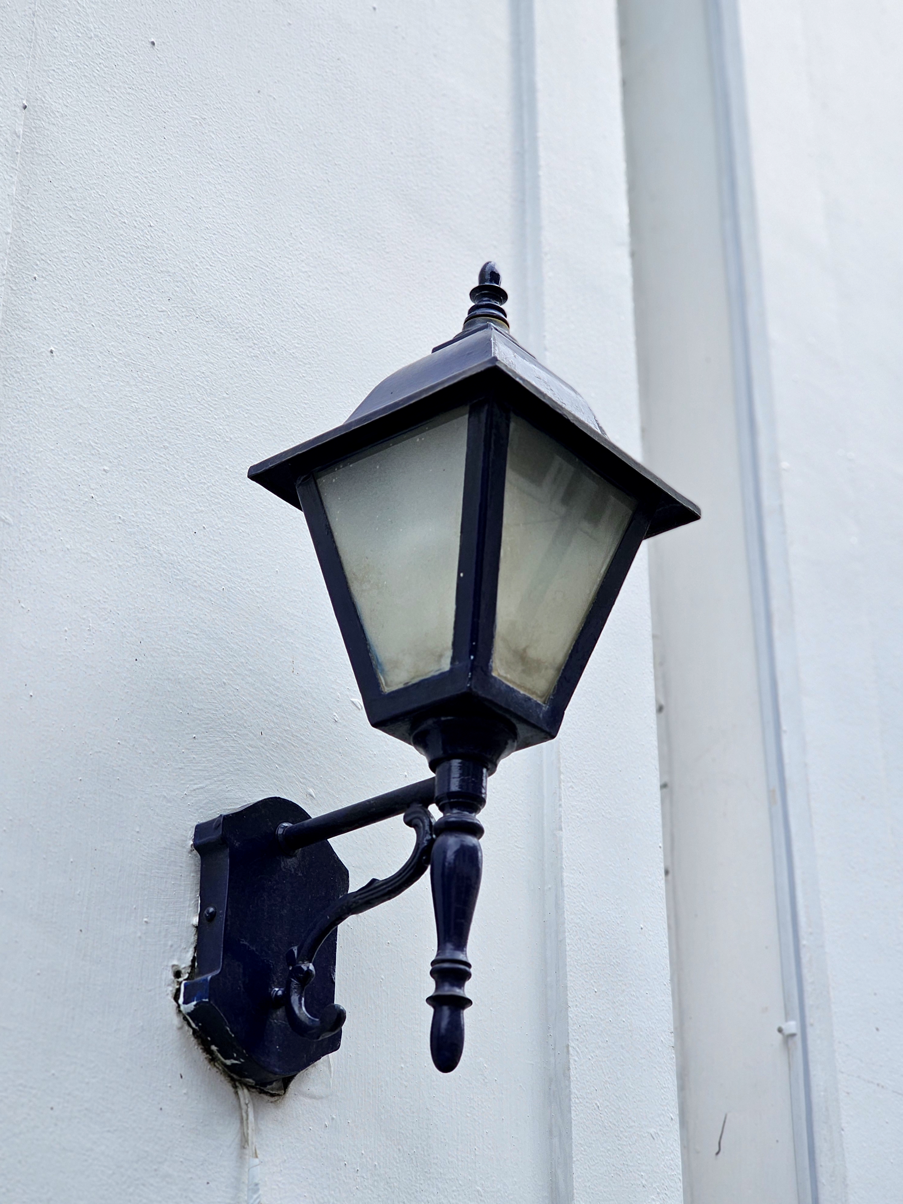 Alternative Text: Wall-mounted colonial-style lantern against a whitewashed wall in Fort Kochi, Kochi. A classic detail of Dutch and Portuguese architecture in this heritage town.