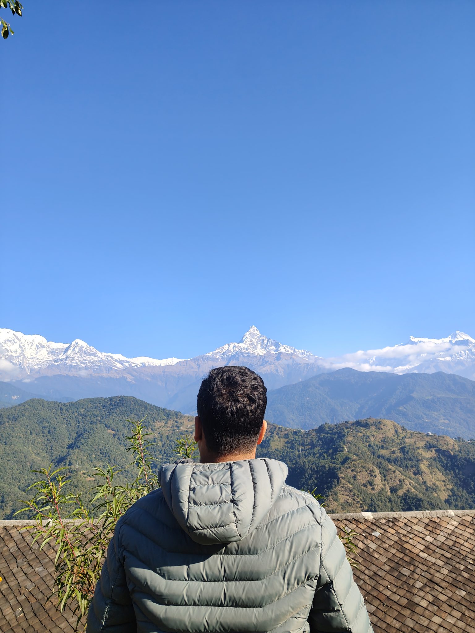 Alternative Text: A person wearing a gray puffer jacket stands with their back to the camera, gazing out at a stunning mountain landscape.