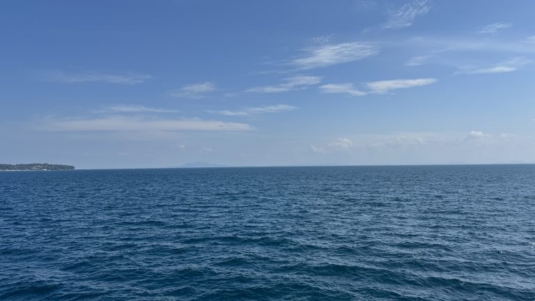 Alternative Text: A wide-angle shot of the horizon over a deep blue ocean under a bright, clear sky with soft white clouds.