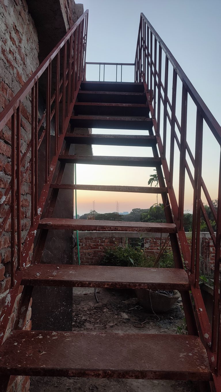 Alternative Text: A low-angle view looking up a rusty red iron staircase attached to a rough brick wall. Through the open steps, a soft sunset sky with orange hues and distant trees is visible.