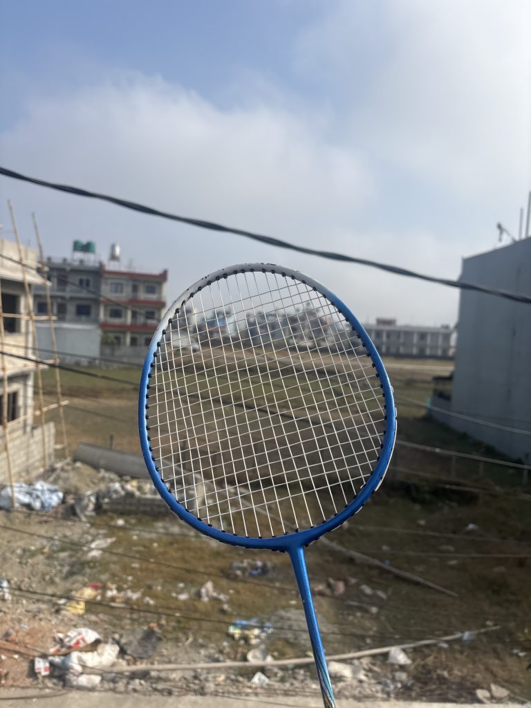 Alternative Text: A close-up of a blue badminton racket held up against a backdrop of a cloudy sky and a construction site.