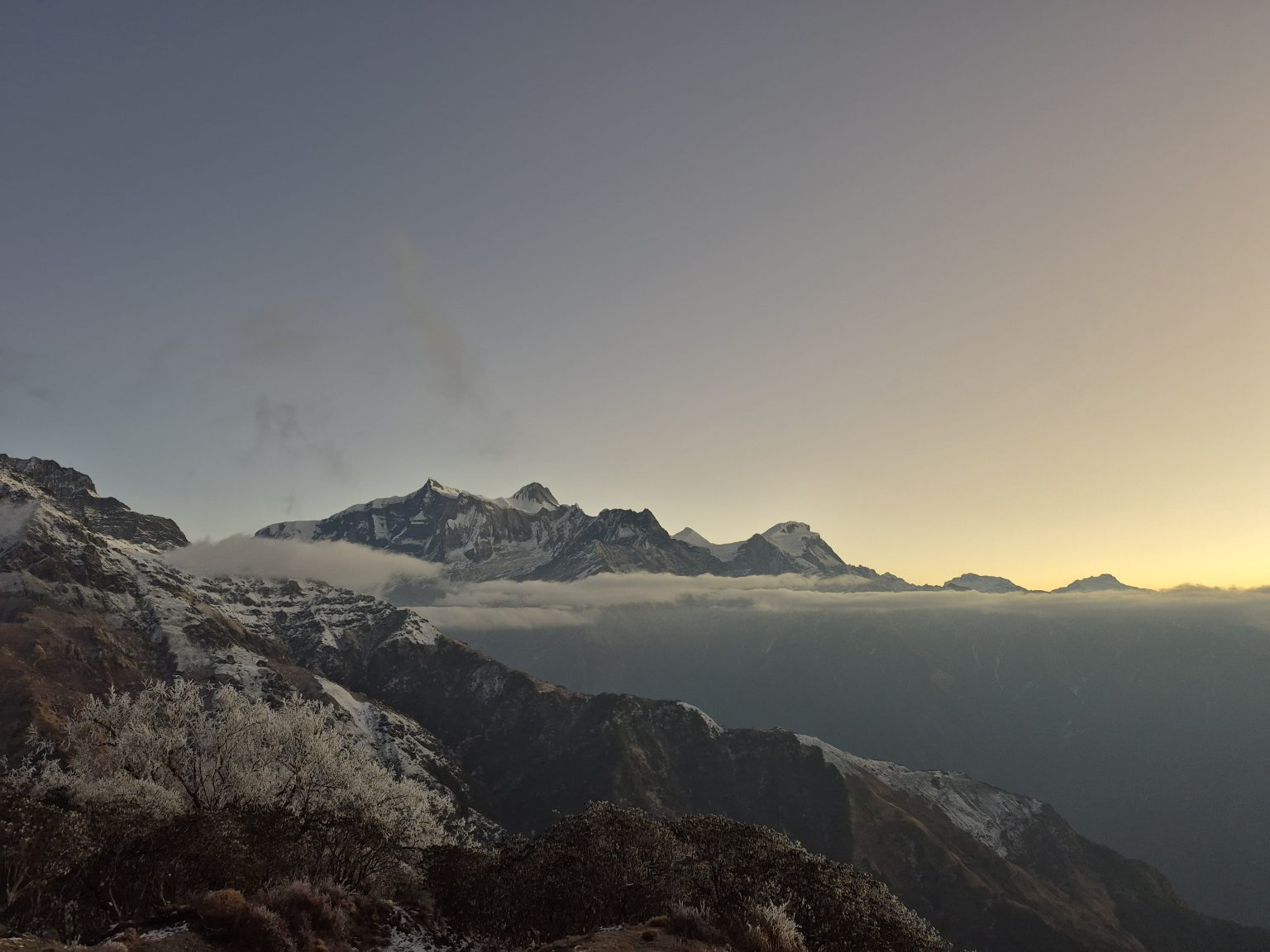 Alternative Text: A panoramic view of snow-capped mountains under a twilight sky, with soft clouds hovering just above the valley.