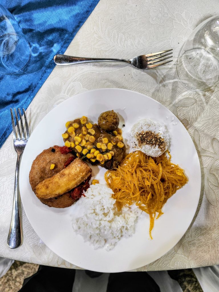 Alternative Text: A Filipino vegetarian meal featuring white rice, sweet-style pancit, a vegetable stew with corn and potatoes, a fried banana on a veggie patty, and grated coconut with sugar.