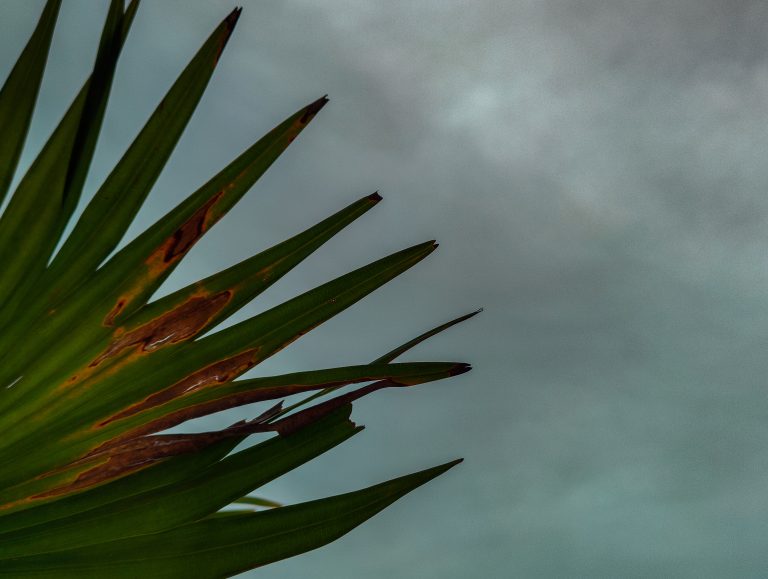 Alternative Text: A dramatic capture from Sylhet, featuring the sharp green blades of a palm leaf set against a moody, overcast sky.