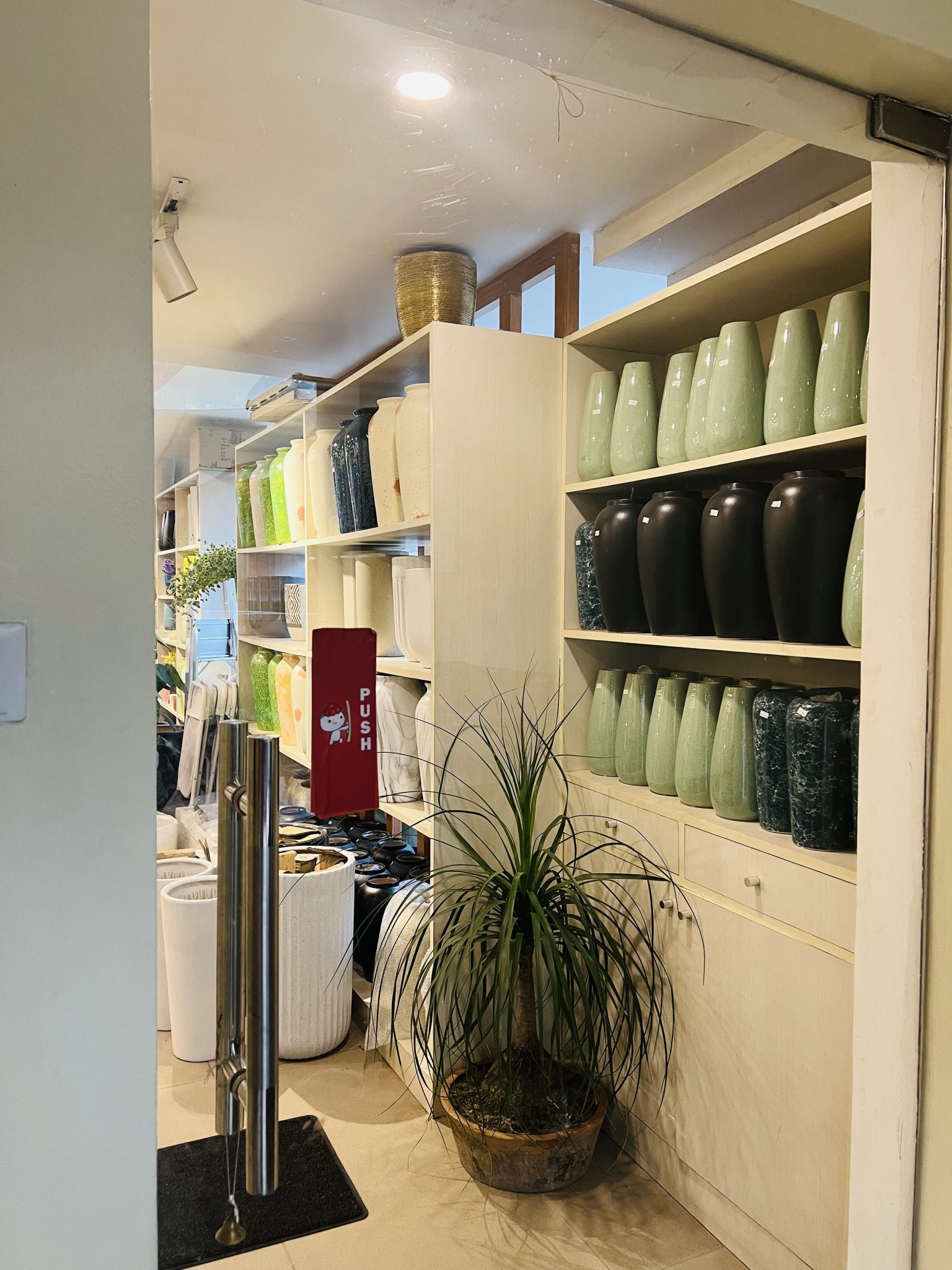 Alternative Text: A photograph from inside a store showing shelves filled with various vases and decorative items. In the foreground, a large potted plant sits on the floor.