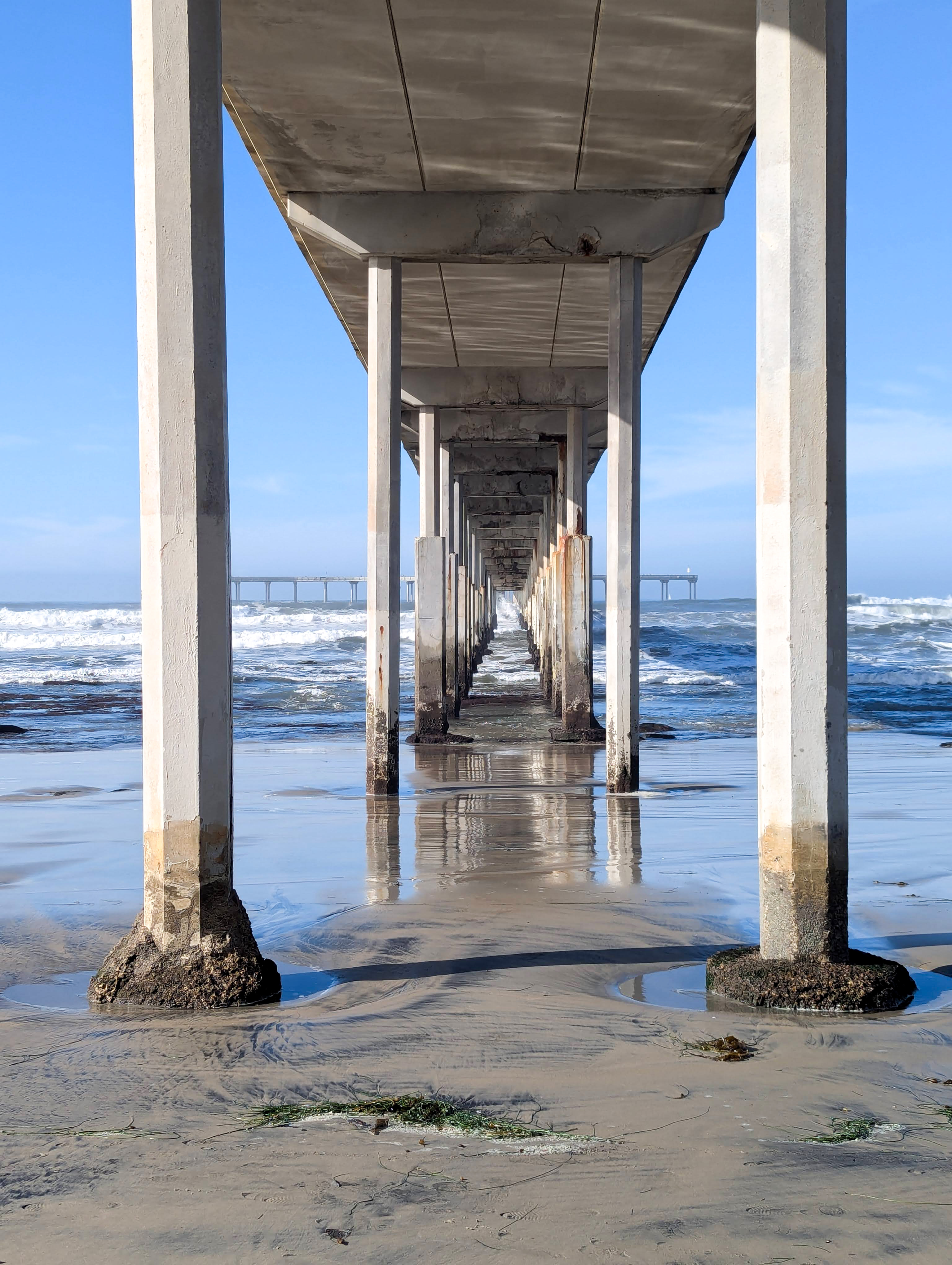 Alternative Text: Underneath the Ocean Beach Pier in San Diego, CA. A forced-perspective view underneath concrete pier pylons with a wet sandy beach in the foreground and churning ocean waves in the background.