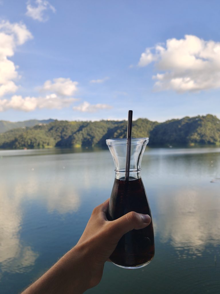 Alternative Text: A hand holding a glass carafe of dark liquid with a straw, set against a tranquil lake surrounded by lush green mountains and a blue sky with fluffy white clouds reflected in the water.