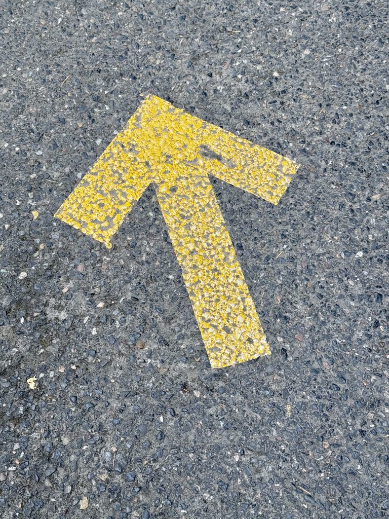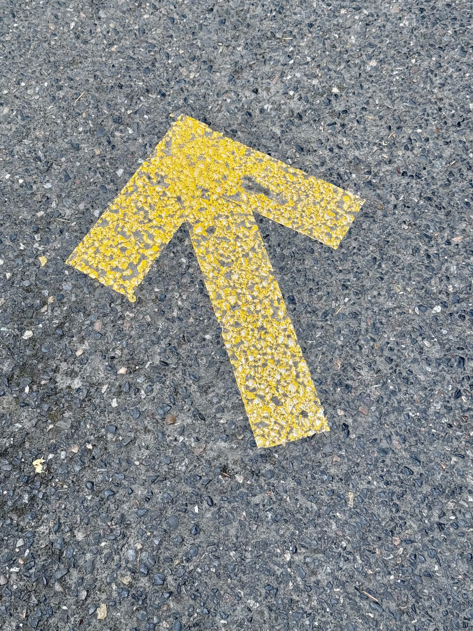 Alternative Text: A yellow painted arrow on a rough blacktop road pointing diagonally forward, indicating direction. Photo taken near the Portland Japanese Garden, Oregon.