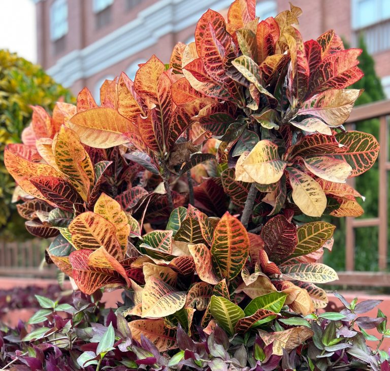 Alternative Text: A vibrant arrangement of plants featuring a bush with large, colorful leaves in shades of orange, red, and green, showcasing intricate patterns