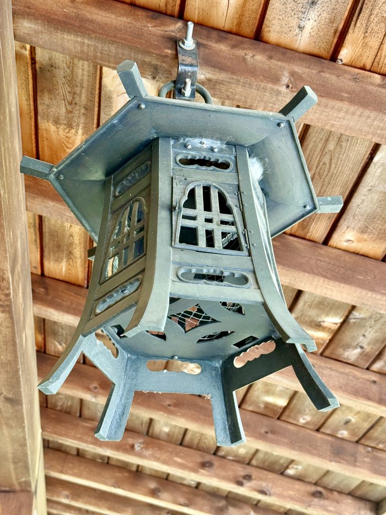Alternative Text: A close-up of a traditional Japanese-style hanging lantern made of metal, captured under a wooden roof at the Portland Japanese Garden. The intricate design adds cultural charm to the peaceful garden setting.