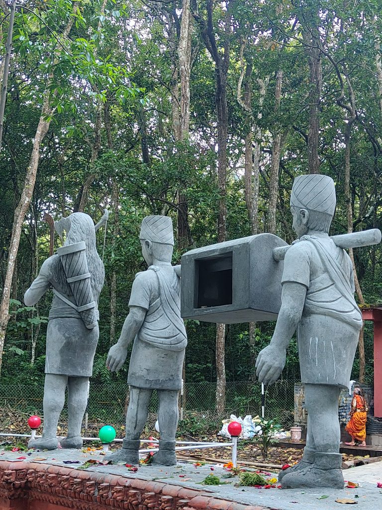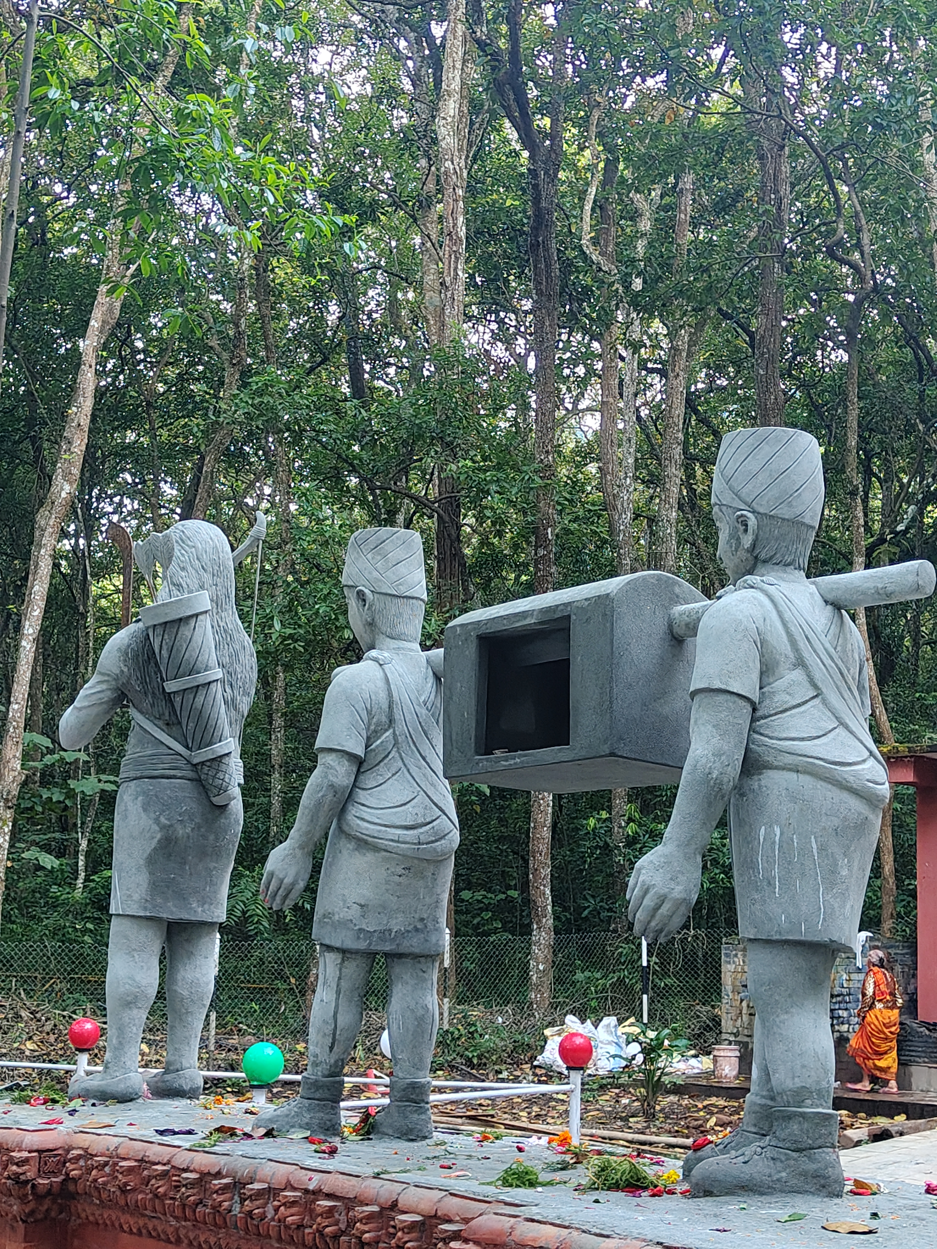 Alternative Text: Three stone sculptures are positioned in a forested area, depicting figures dressed in traditional attire.