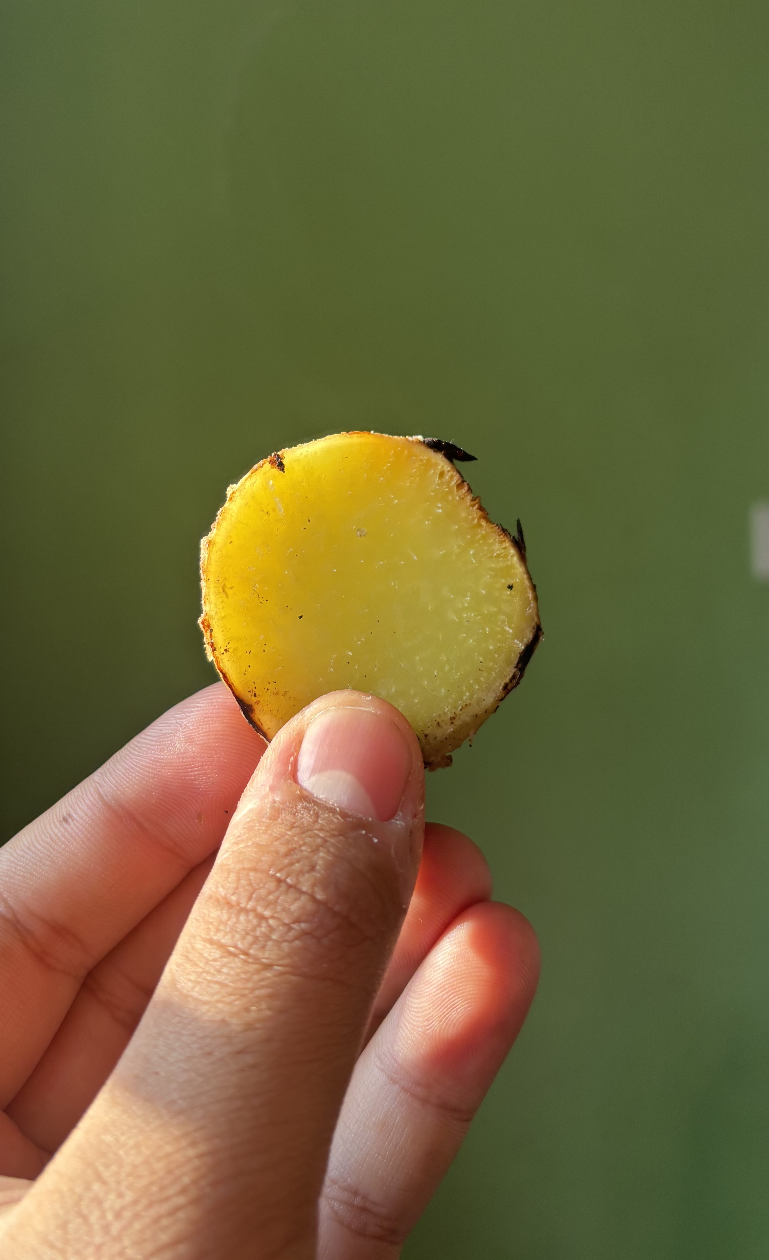 Alternative Text: A close-up of a hand holding a round slice of yellow sweet potato against a soft green background, prepared for Maghe Sankranti.