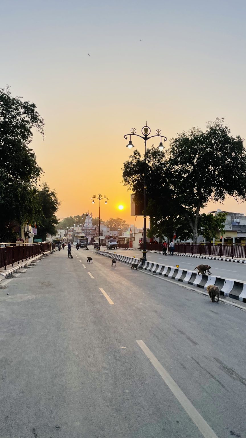 Alternative Text: An empty street at sunrise or sunset, with a few monkeys on the road and sidewalks.