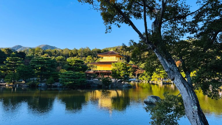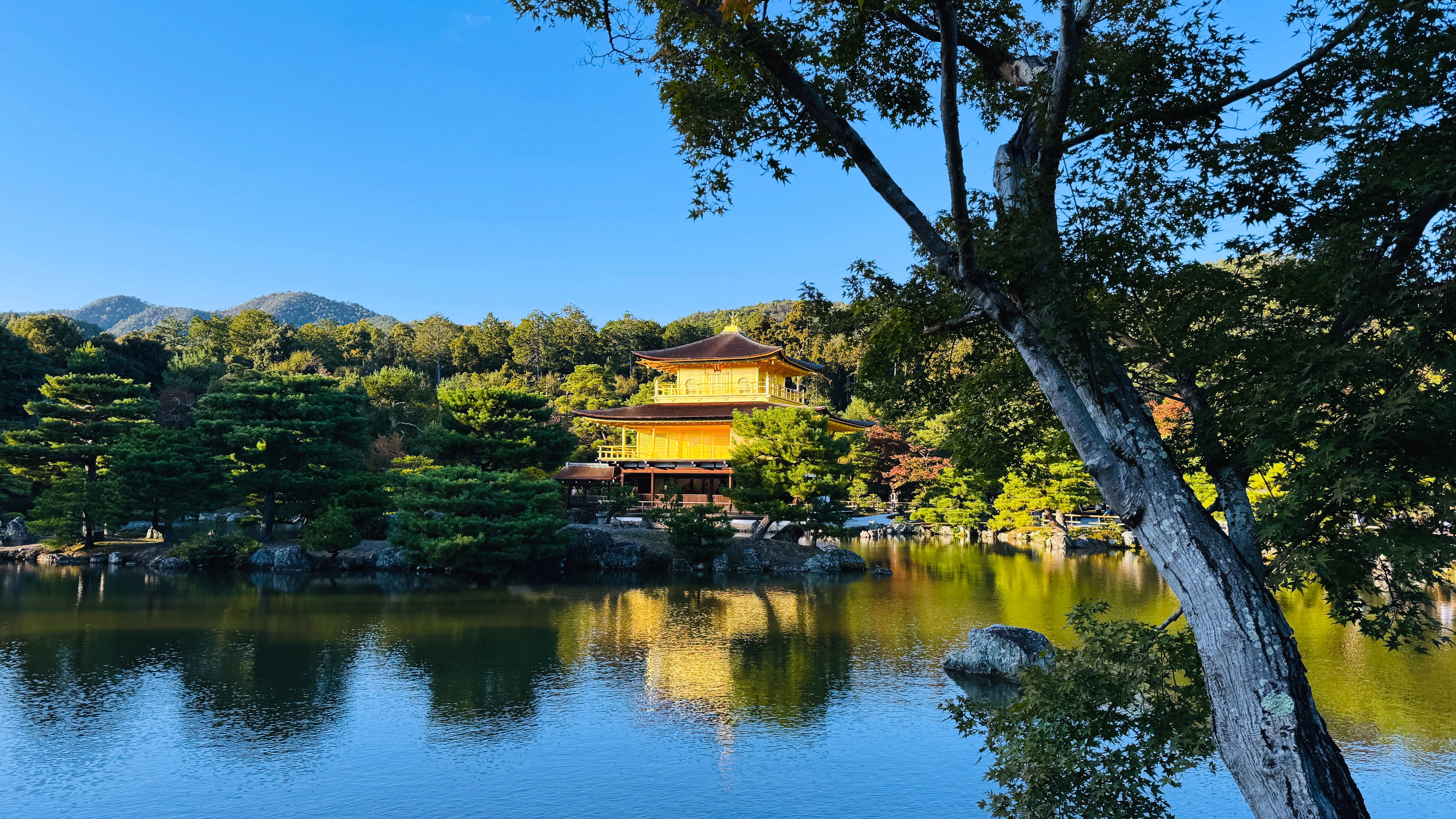 Alternative Text: A serene landscape featuring a golden pavilion situated on the edge of a tranquil pond, surrounded by lush green trees.