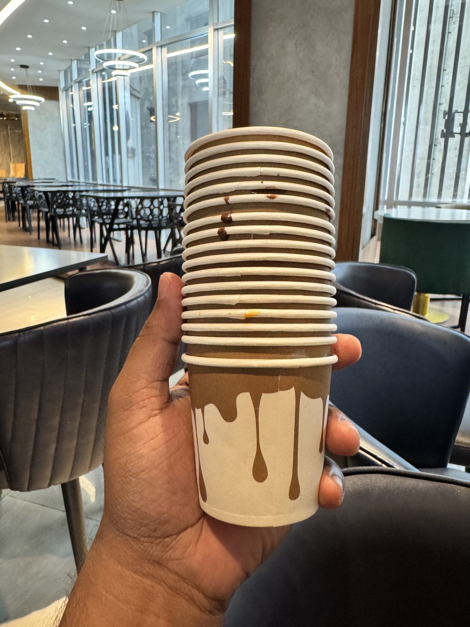 Alternative Text: A hand holds a neat stack of small paper cups with a chocolate-drip design, lightly smudged with real chocolate, against the backdrop of a softly lit modern restaurant.