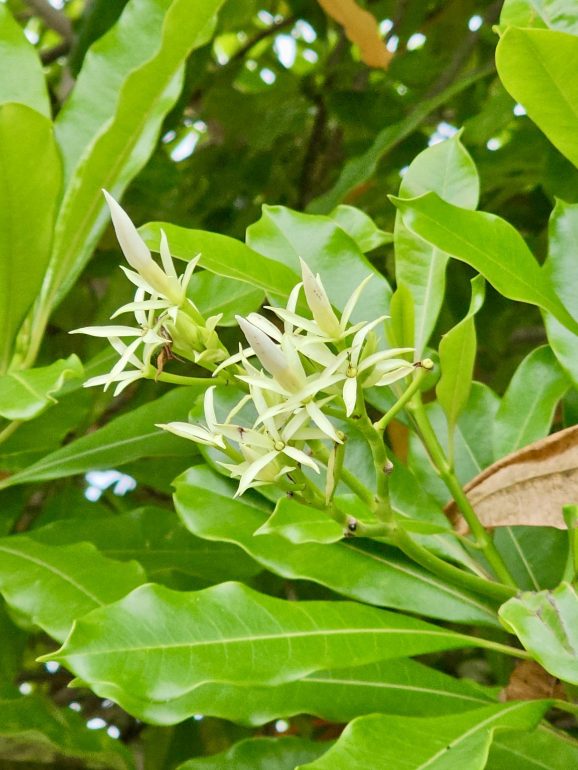 Alternative Text: Small white flowers blooming among glossy green leaves, possibly from a sea mango or pong pong tree (Cerbera odollam). Shot near Fort Kochi Beach, Kerala.