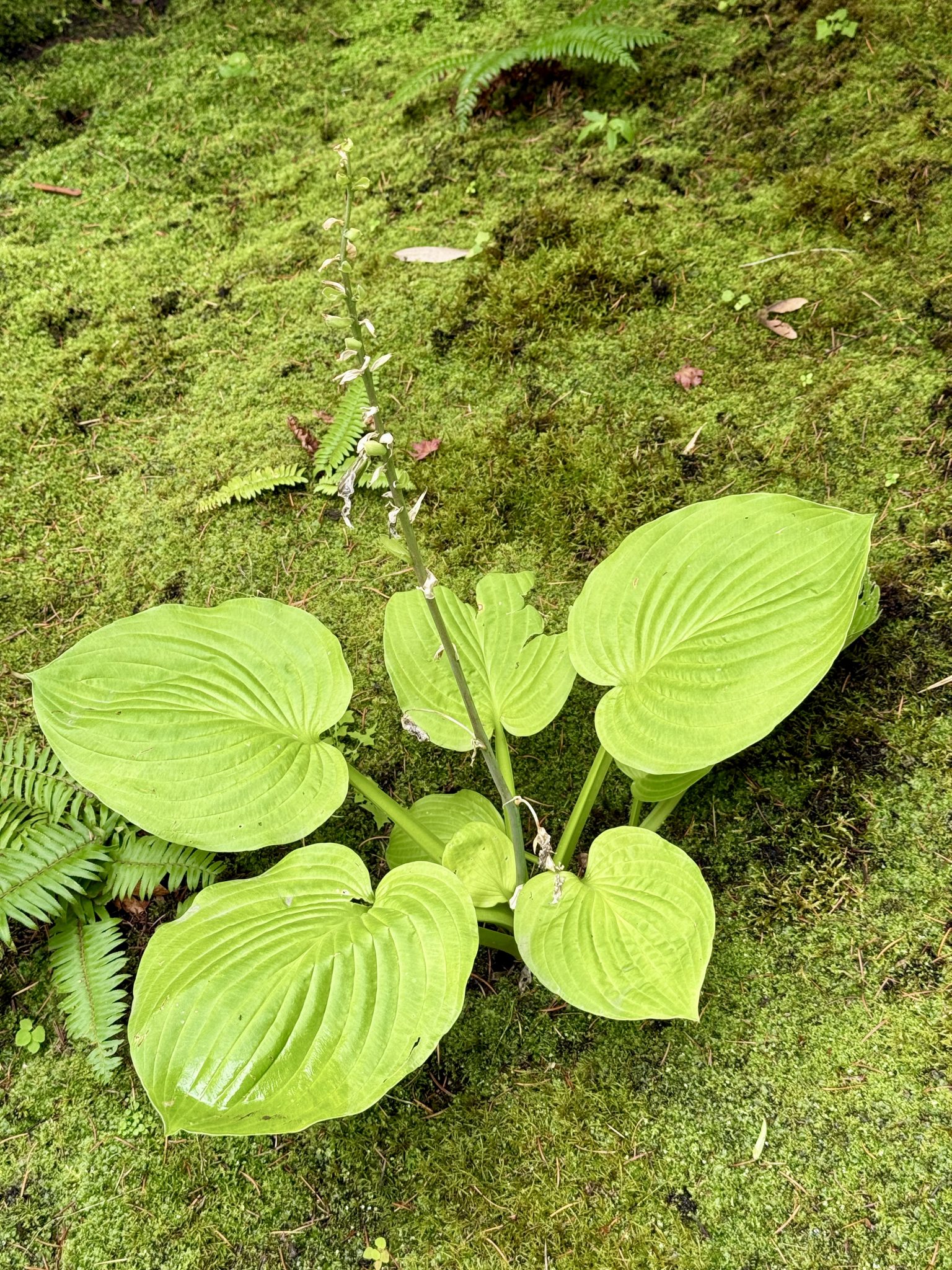 Alternative Text: A vibrant green Hosta plant with large, textured leaves thrives amidst lush mossy ground, showcasing its foliage in a garden setting. Captured from Portland Japanese Garden.