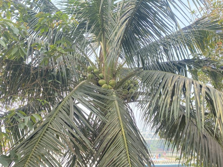 Alternative Text: A tall coconut tree with green coconuts under a blue sky.
