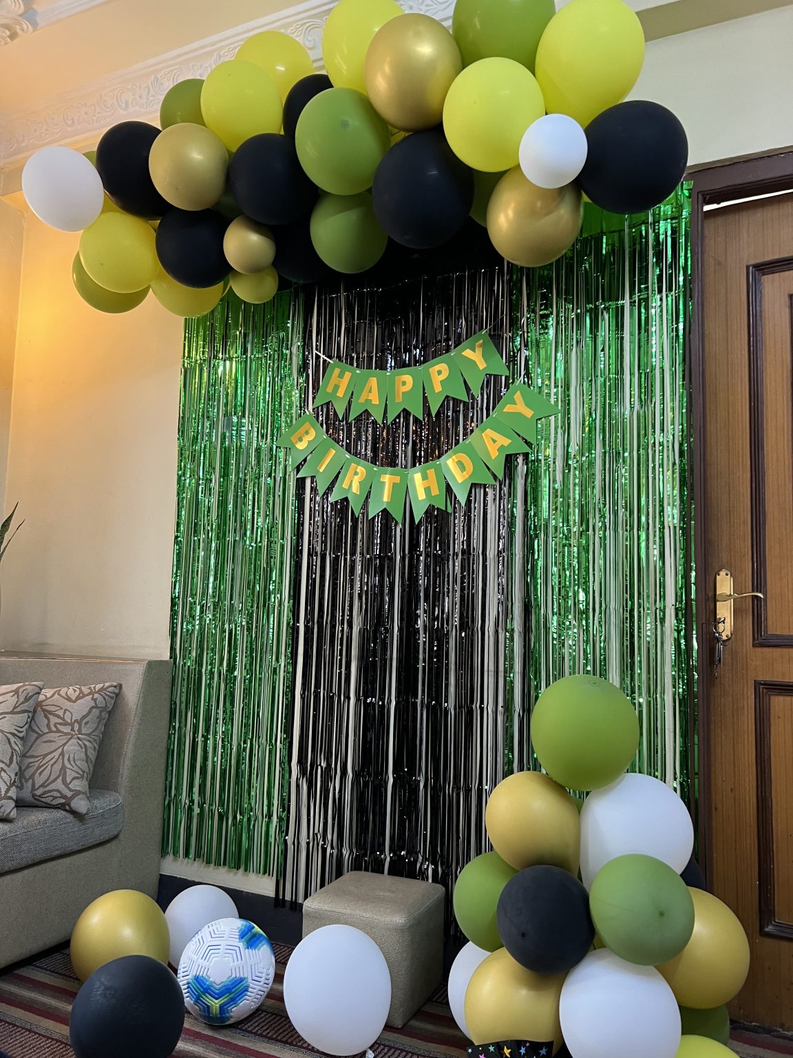 Alternative Text: A birthday party scene is decorated with balloons in green, black, gold, and white. A “Happy Birthday” banner hangs over a shiny green and black streamer curtain.