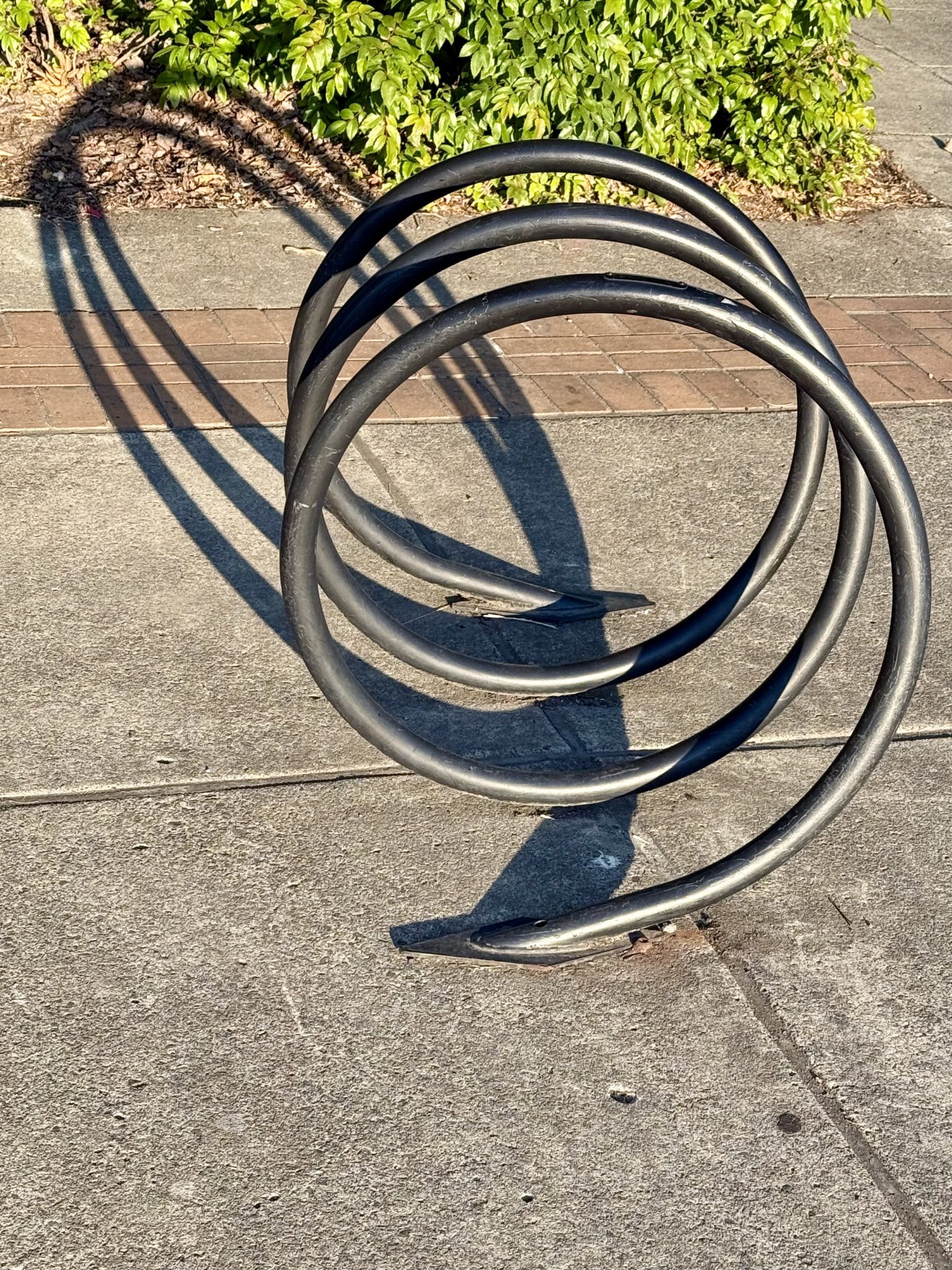 Alternative Text: A black spiral-shaped bike rack casting a long shadow on the sidewalk near Tilikum Crossing Bridge in Portland.