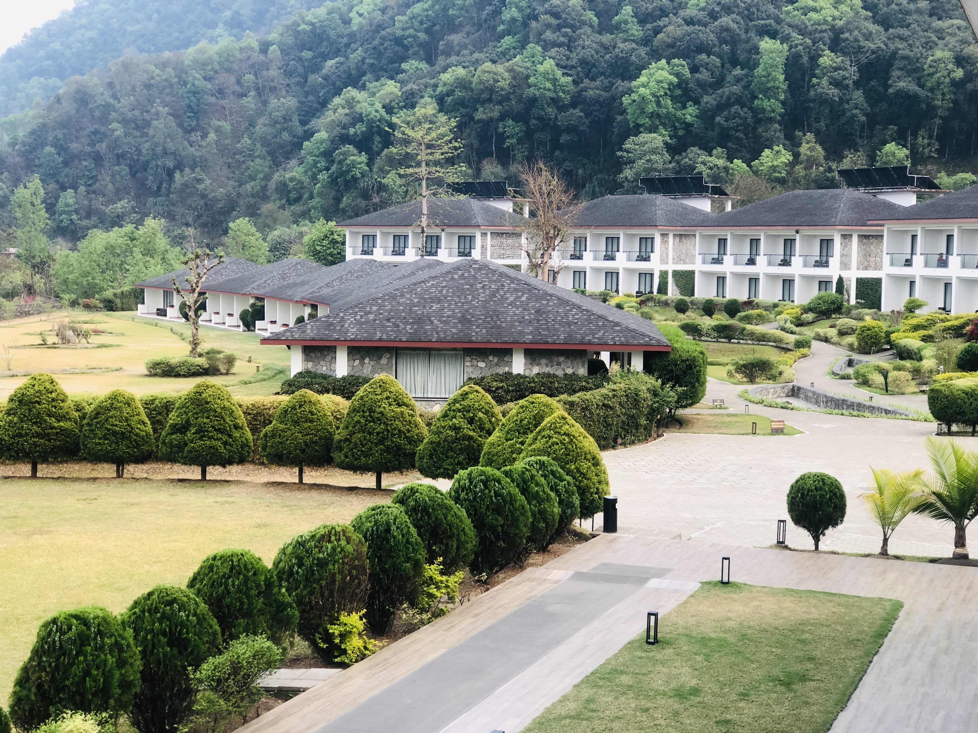 Alternative Text: A view of a landscaped area featuring manicured hedges and bushes, with a cluster of buildings in the background.