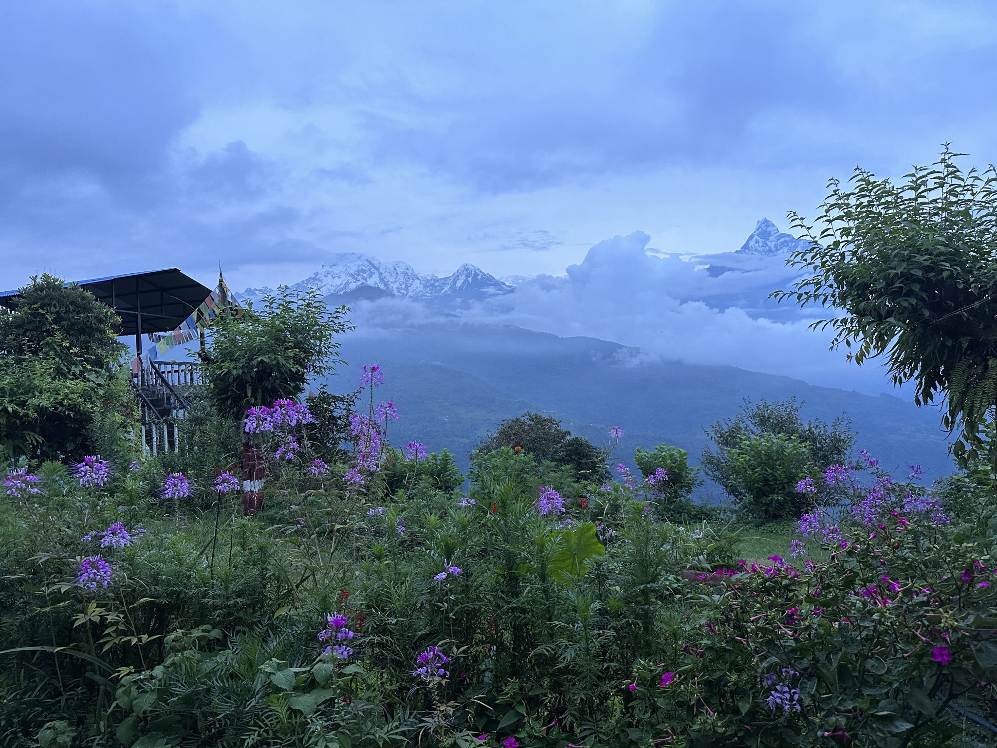 Alternative Text: Snow-capped mountains in the background under a cloudy blue sky. In the foreground is a small wooden building with prayer flags. There are purple flowers in the grass.