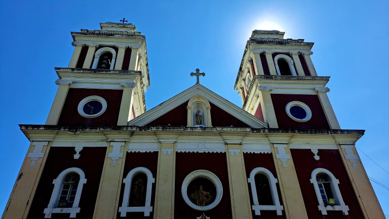 Alternative Text: A view of a historic church with two prominent bell towers, each topped with a cross.