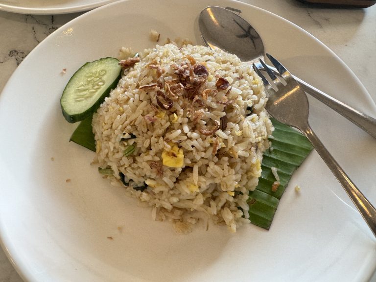 Alternative Text: A plate of fried rice garnished with crispy shallots, served atop a piece of banana leaf.