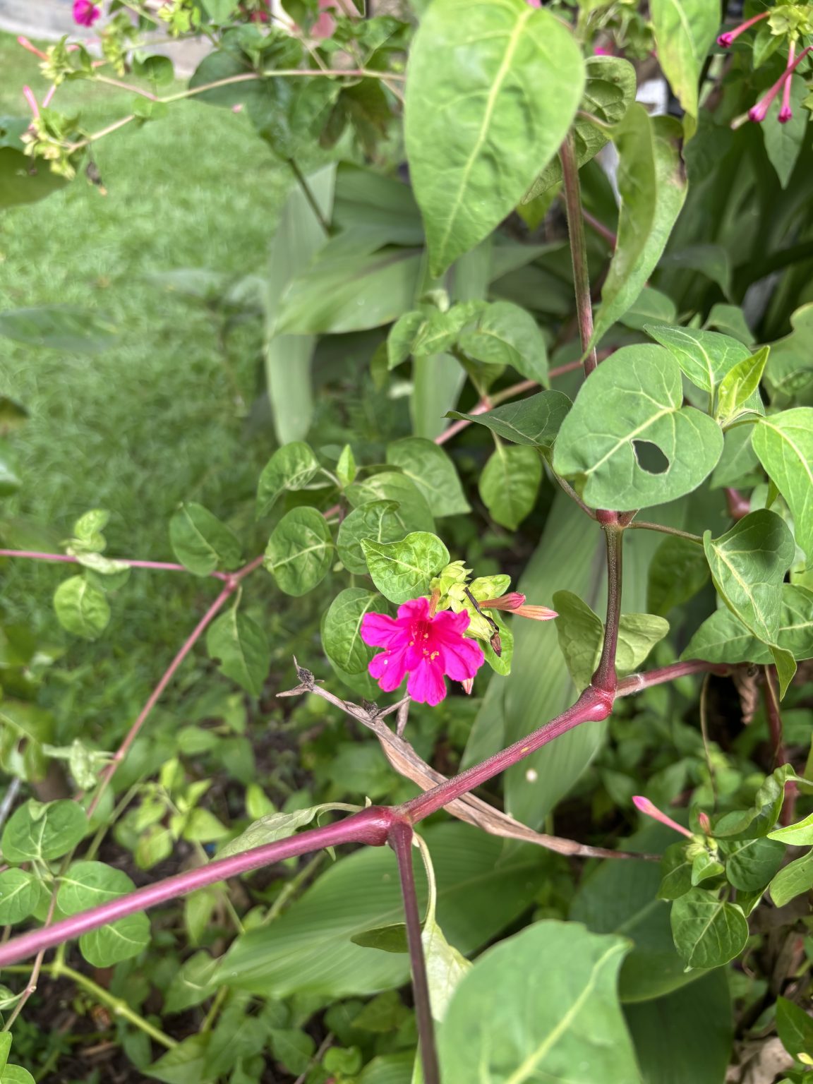 Alternative Text: A close-up view of a flowering plant with vibrant pink flowers peeking through lush green leaves.