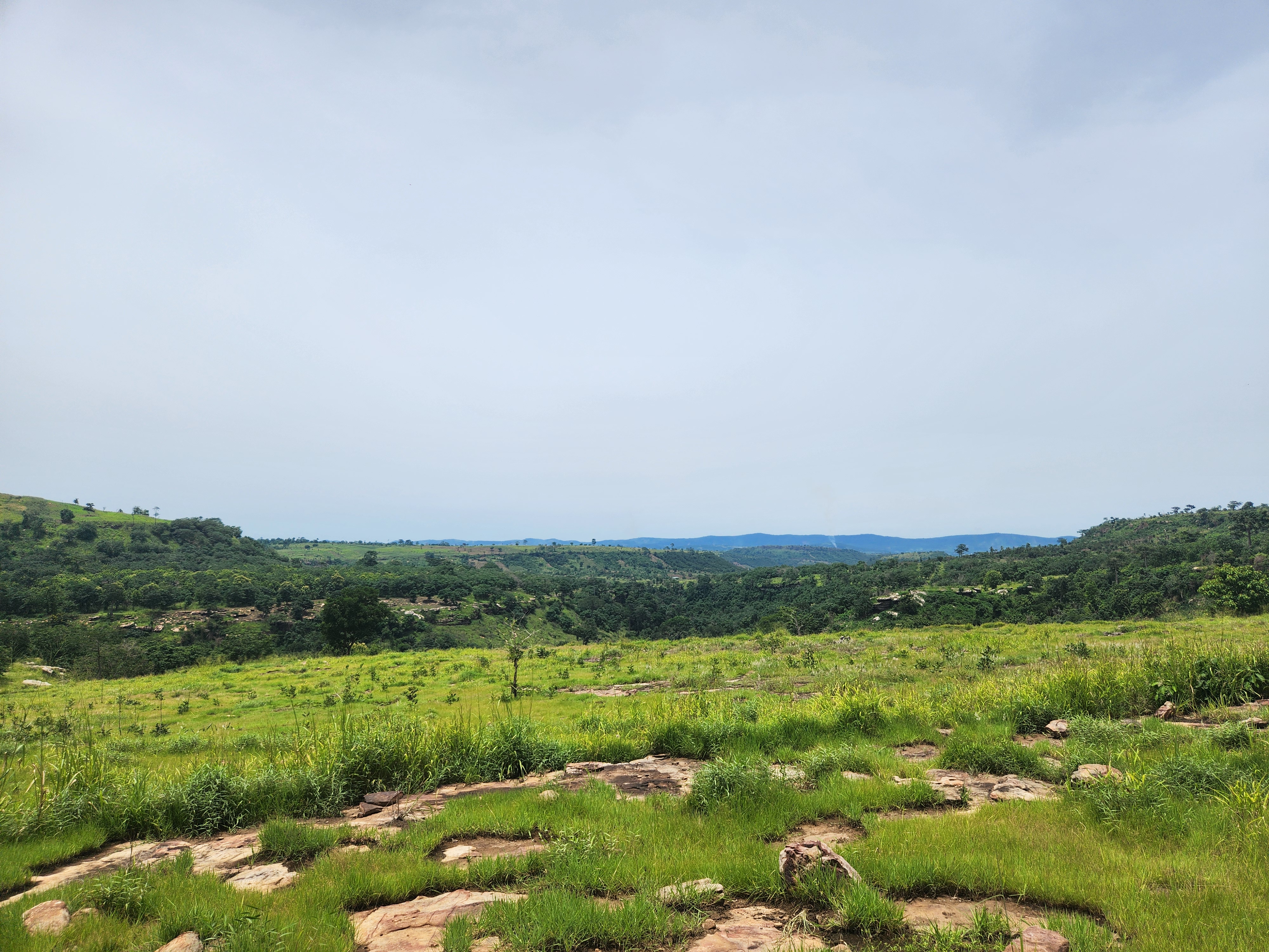 Alternative Text: Wide landscape view featuring green grassy plains, scattered rocks in the foreground, and densely forested hills stretching into the distance under a pale blue sky.