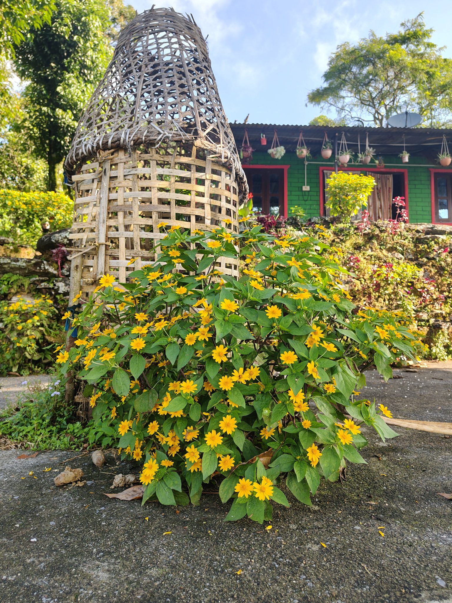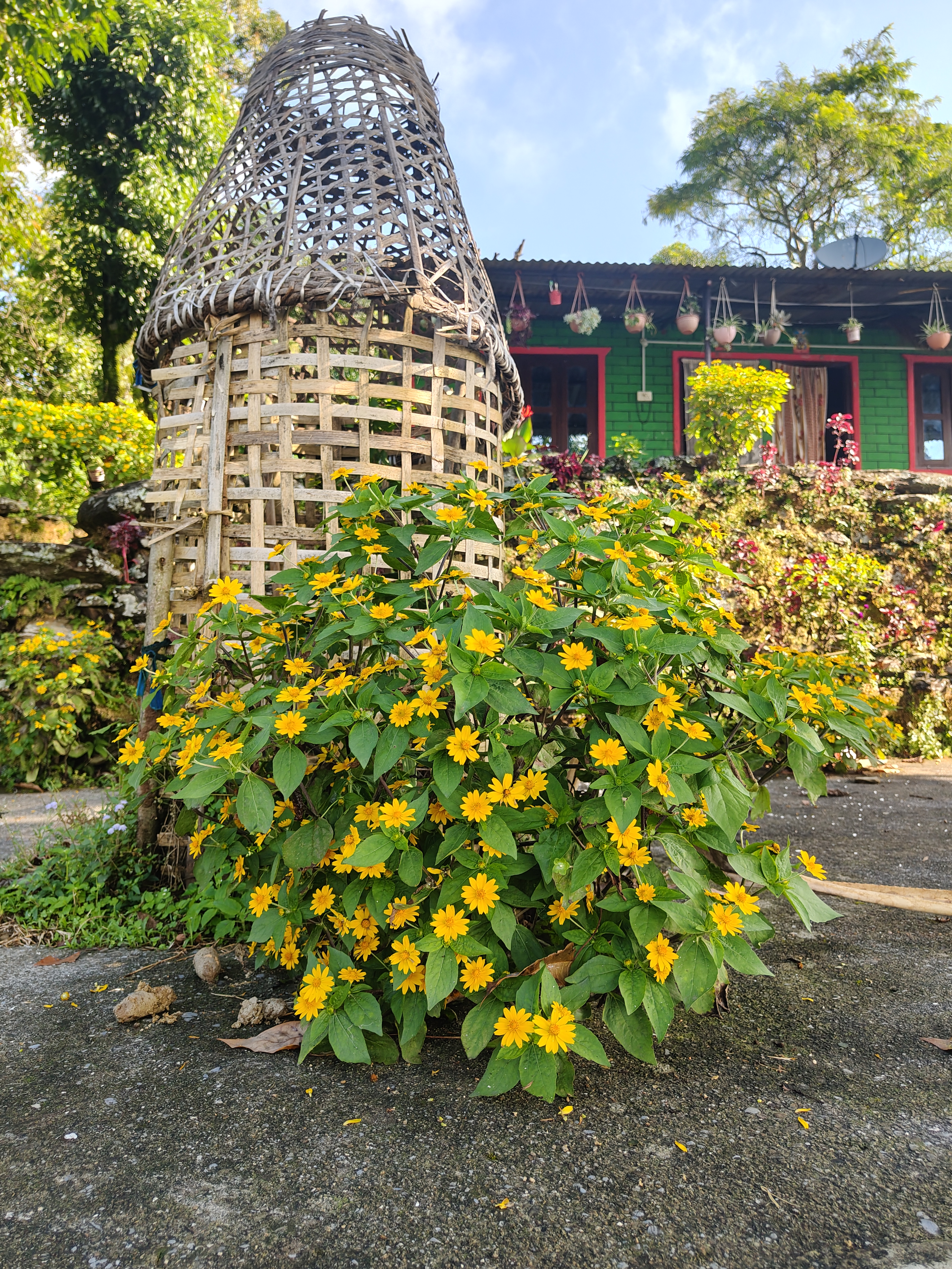 Alternative Text: A woven bamboo structure, resembling a traditional basket, stands beside a lively bush blooming with vibrant yellow flowers