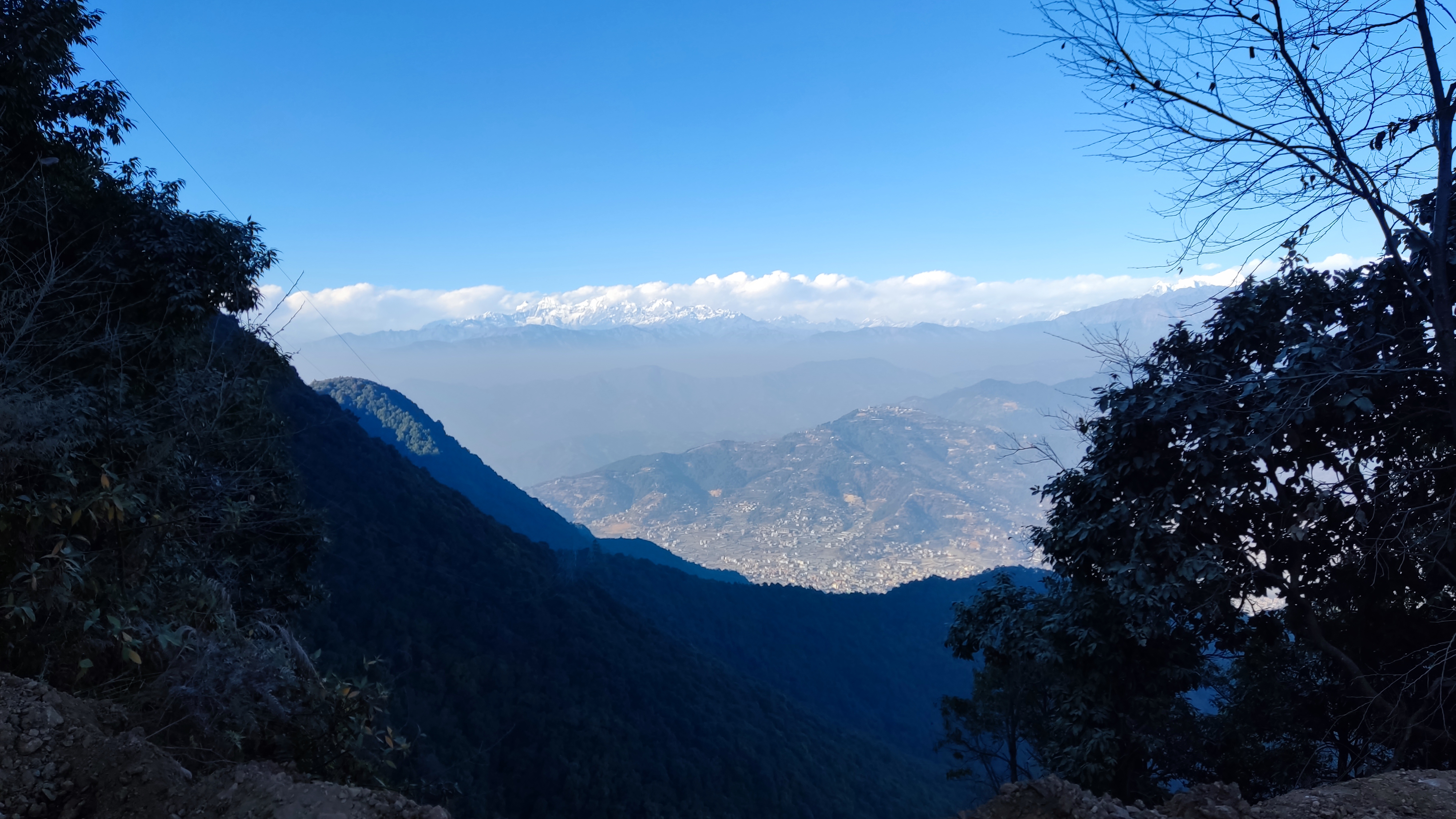 Alternative Text: A panoramic view of a mountainous landscape under a clear blue sky, with distant snow-capped peaks visible.