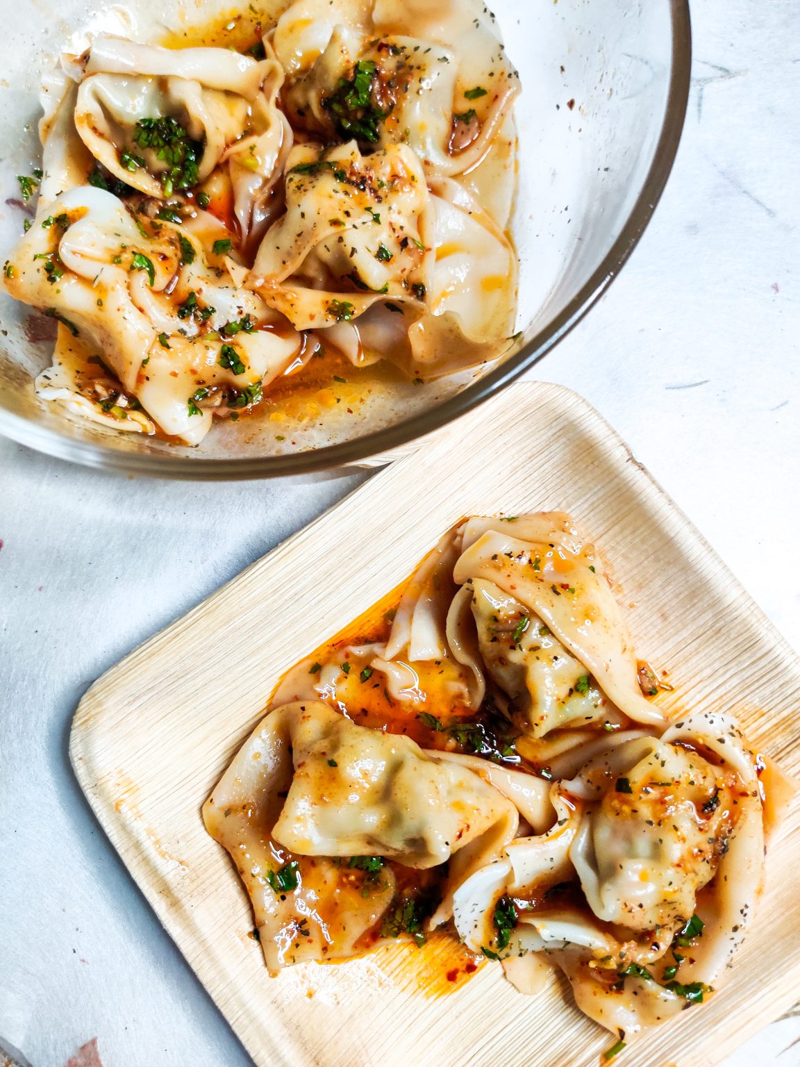 Alternative Text: A glass bowl filled with multiple pieces of dumplings coated in a shiny sauce, garnished with chopped herbs and spices. Next to it, a bamboo plate holds several dumplings drizzled with the same sauce, showcasing their plump, folded shape.