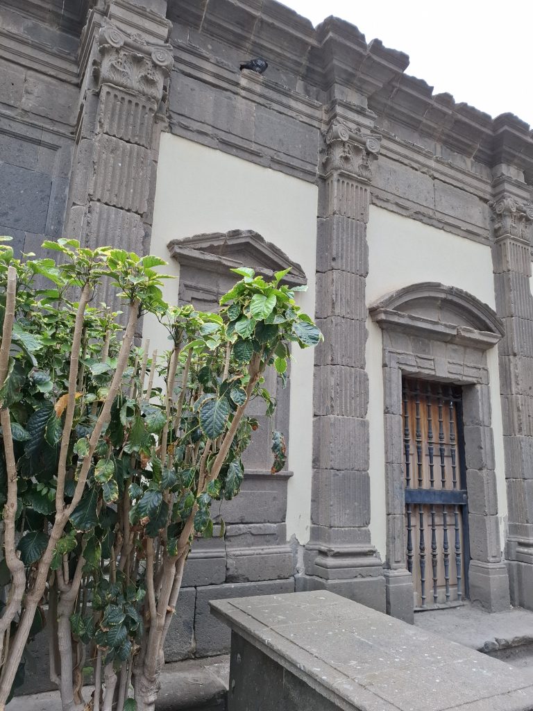 Alternative Text: Old-looking building with a wooden door behind a metal door. There are plants in front of the building.