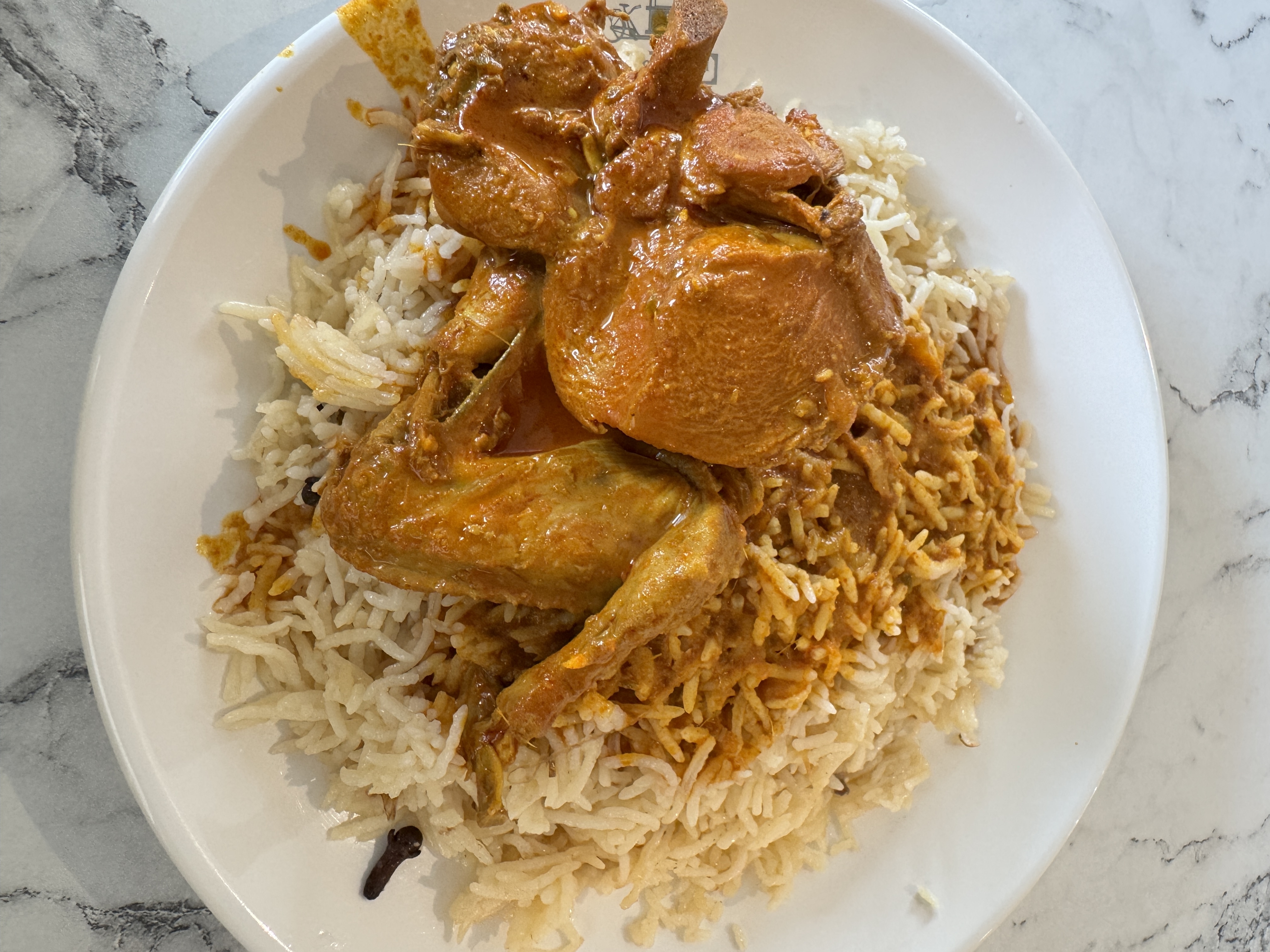 Alternative Text: A white plate of long-grain rice topped with chicken in orange gravy, with a clove visible on the side.