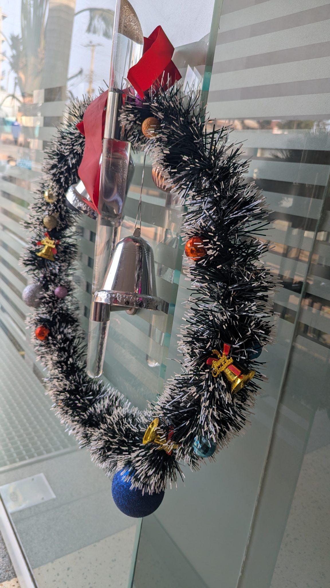 Alternative Text: A decorative Christmas wreath made of black and silver tinsel, adorned with colorful ornaments, including small bells, glittery balls, and ribbons.