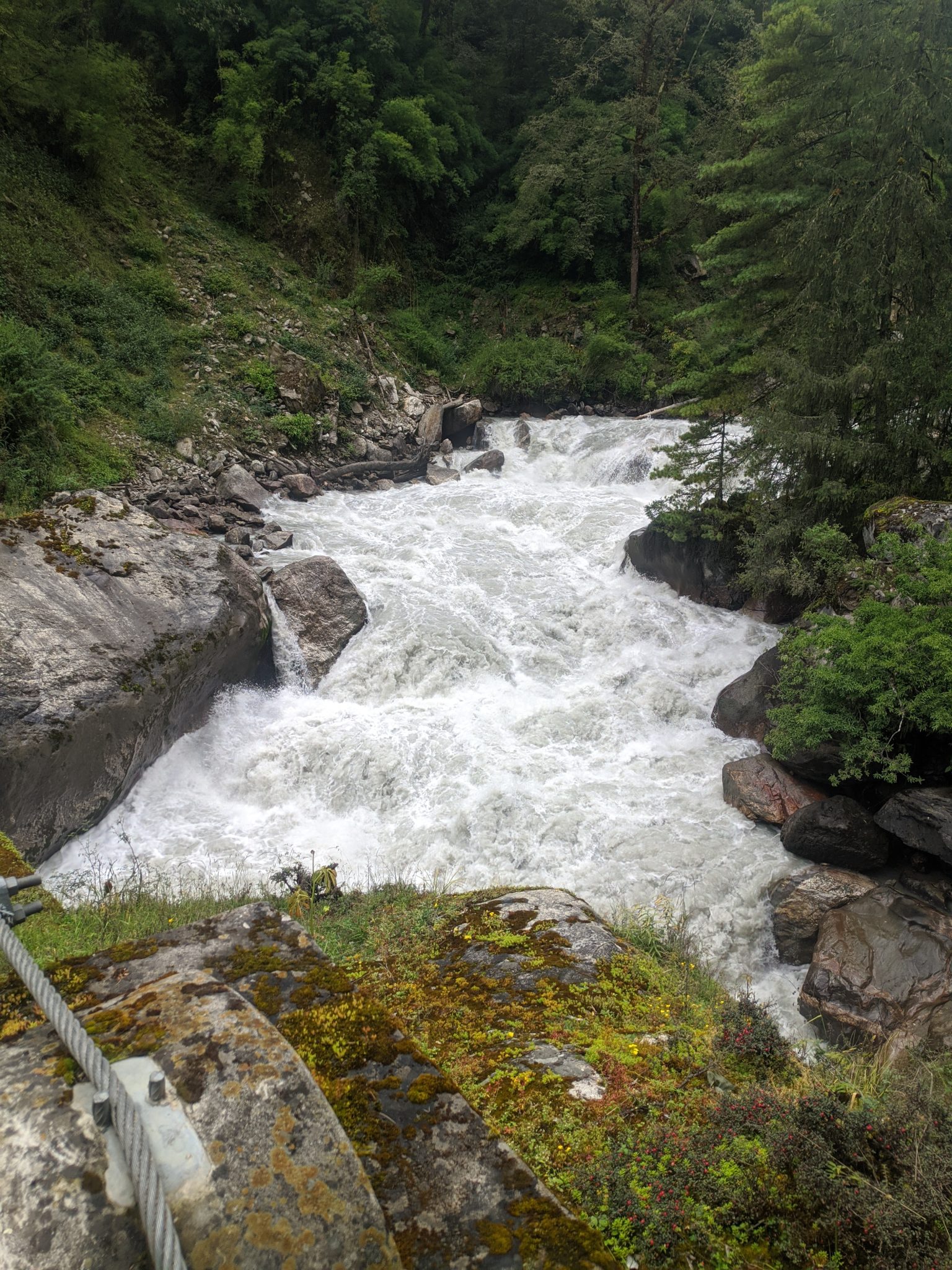 Alternative Text: A turbulent river cascades over rocks, surrounded by lush greenery and dense trees. The water appears frothy and rapid, flowing powerfully through a rocky landscape with patches of grass and moss in the foreground.