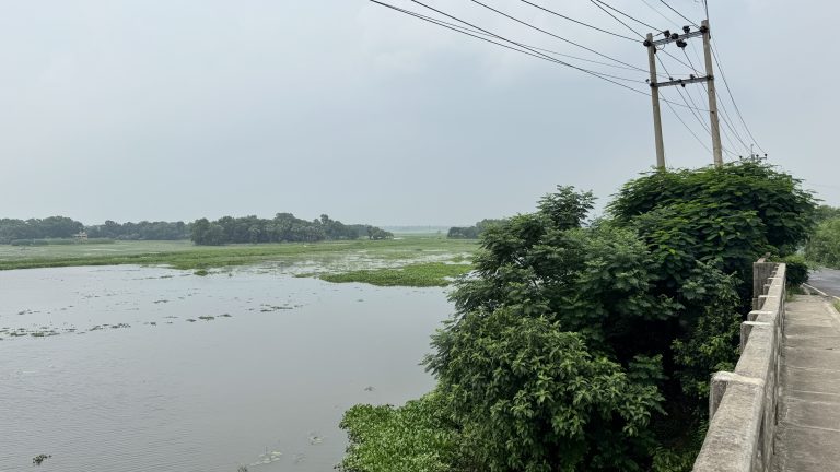 Alternative Text: A view from a roadside looking out over a vast, watery landscape under a hazy sky. A large, leafy green bush is in the foreground next to a utility pole with power lines overhead, framing the view of the river dotted with patches of green vegetation.