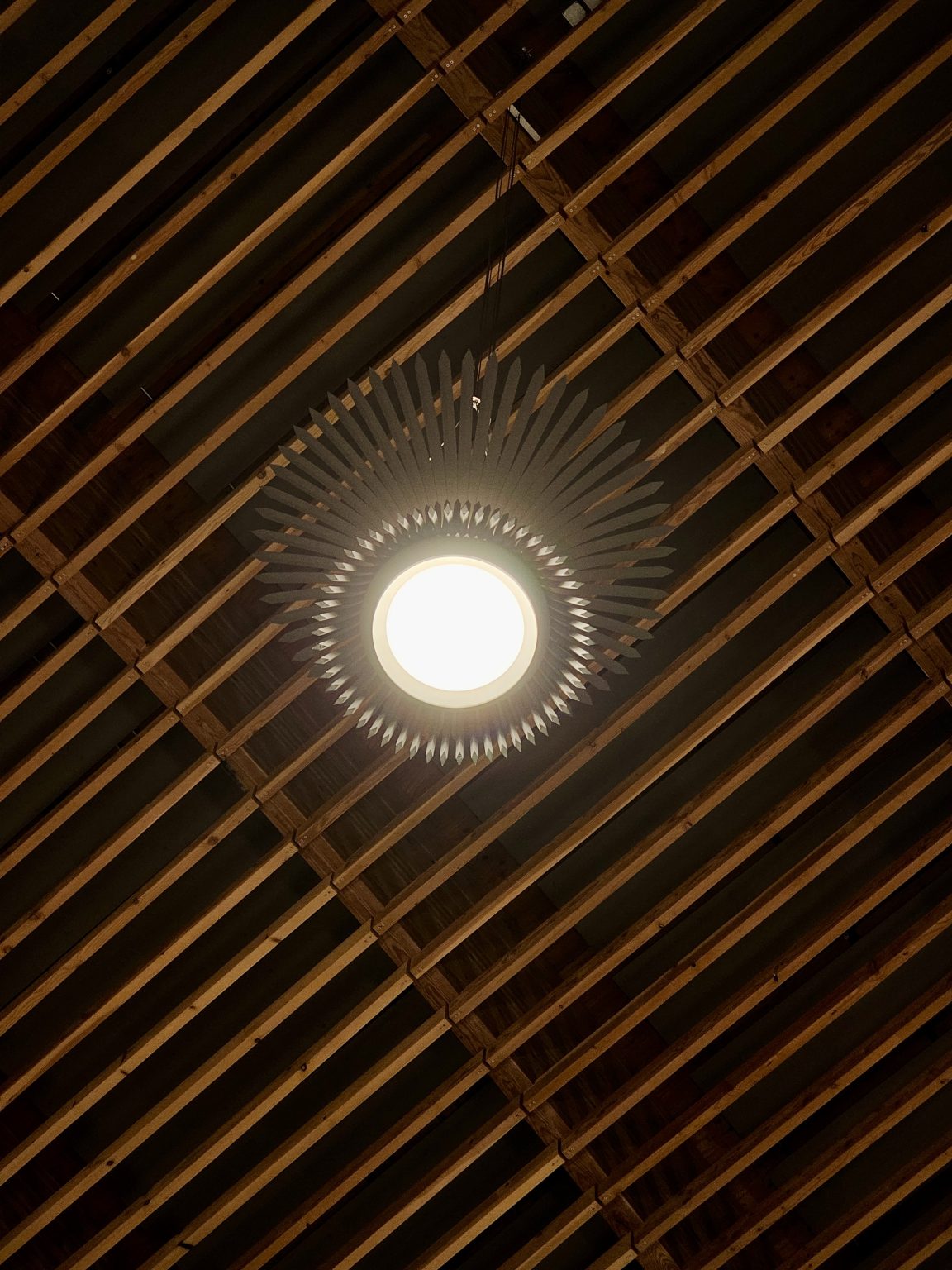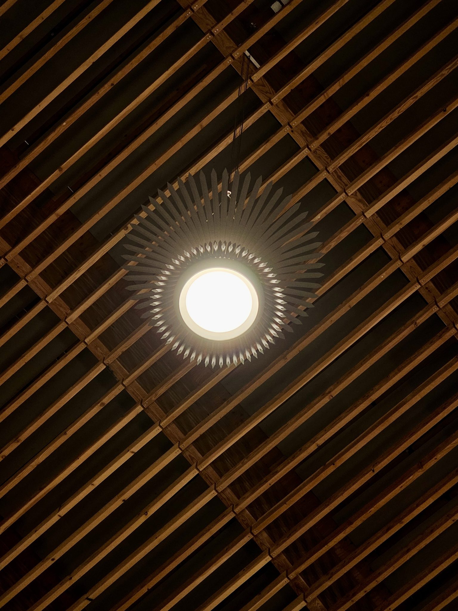 Alternative Text: A close-up of a single decorative ceiling light at Portland International Airport. The lamp has a sunburst-style design and hangs from a wooden slat ceiling, adding an artistic touch to the airport architecture.
