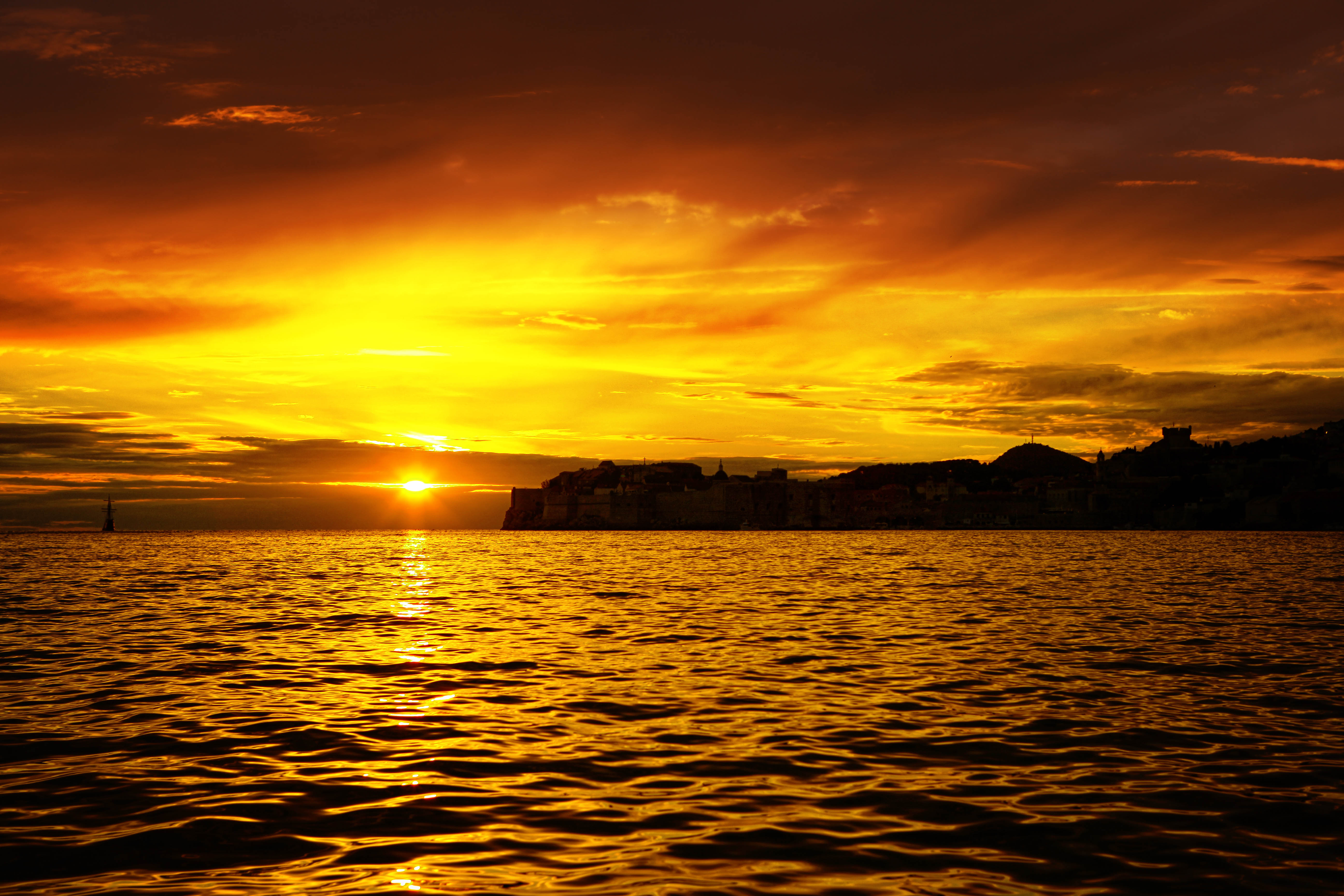 Alternative Text: The sun is setting over the sea, painting the sky in bright orange and yellow colors.