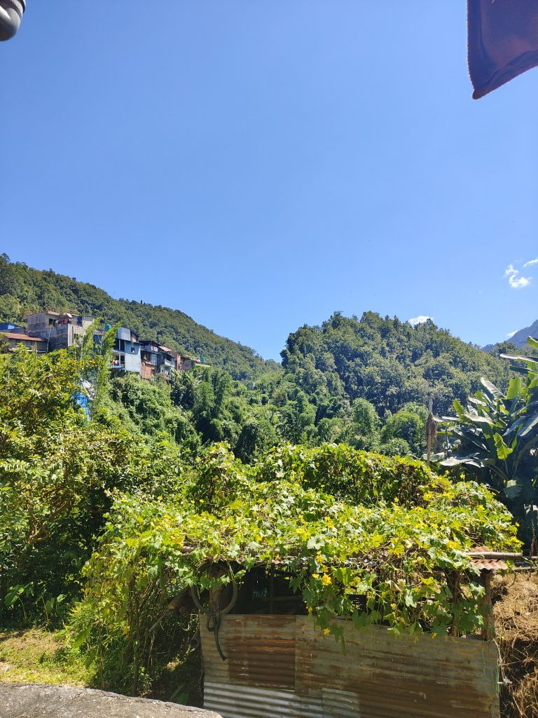 Alternative Text: A bright hillside with green mountains, colorful houses, and a metal structure partly hidden by foliage.