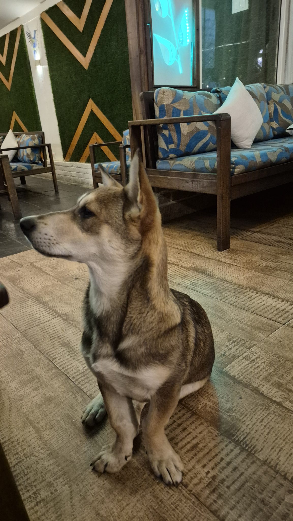 Alternative Text: A medium-sized dog sits on wooden flooring in a cozy indoor setting.