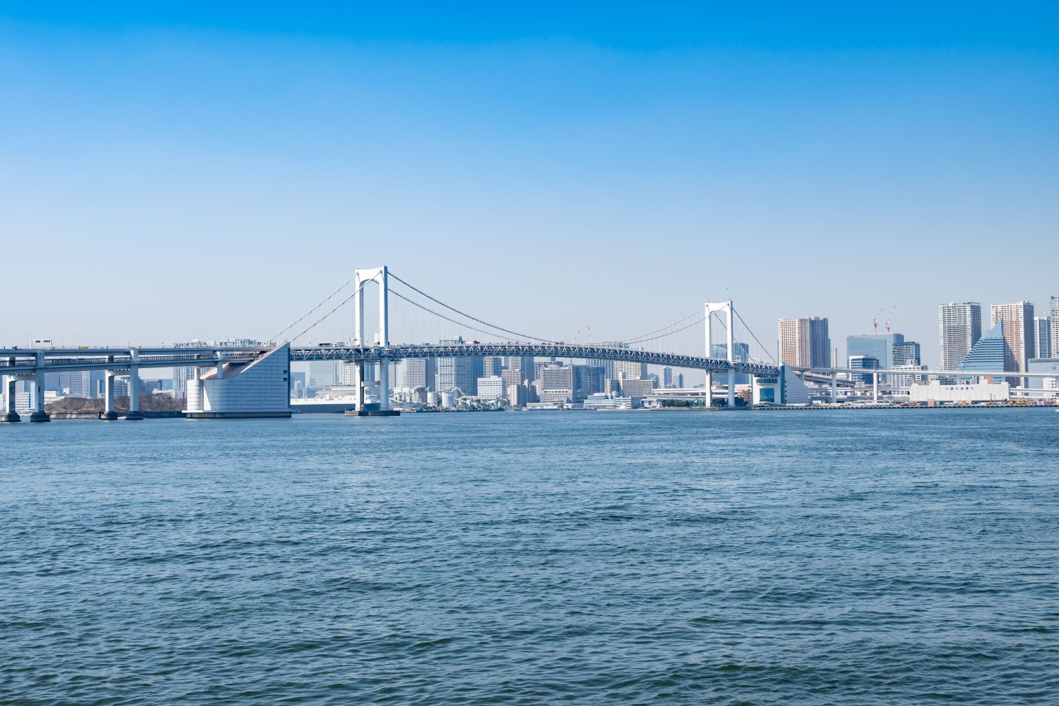 Alternative Text: The Rainbow Bridge stretches across the blue waters of Tokyo Bay beneath a clear blue sky, with the skyline from Tennozu to Odaiba visible in the distance