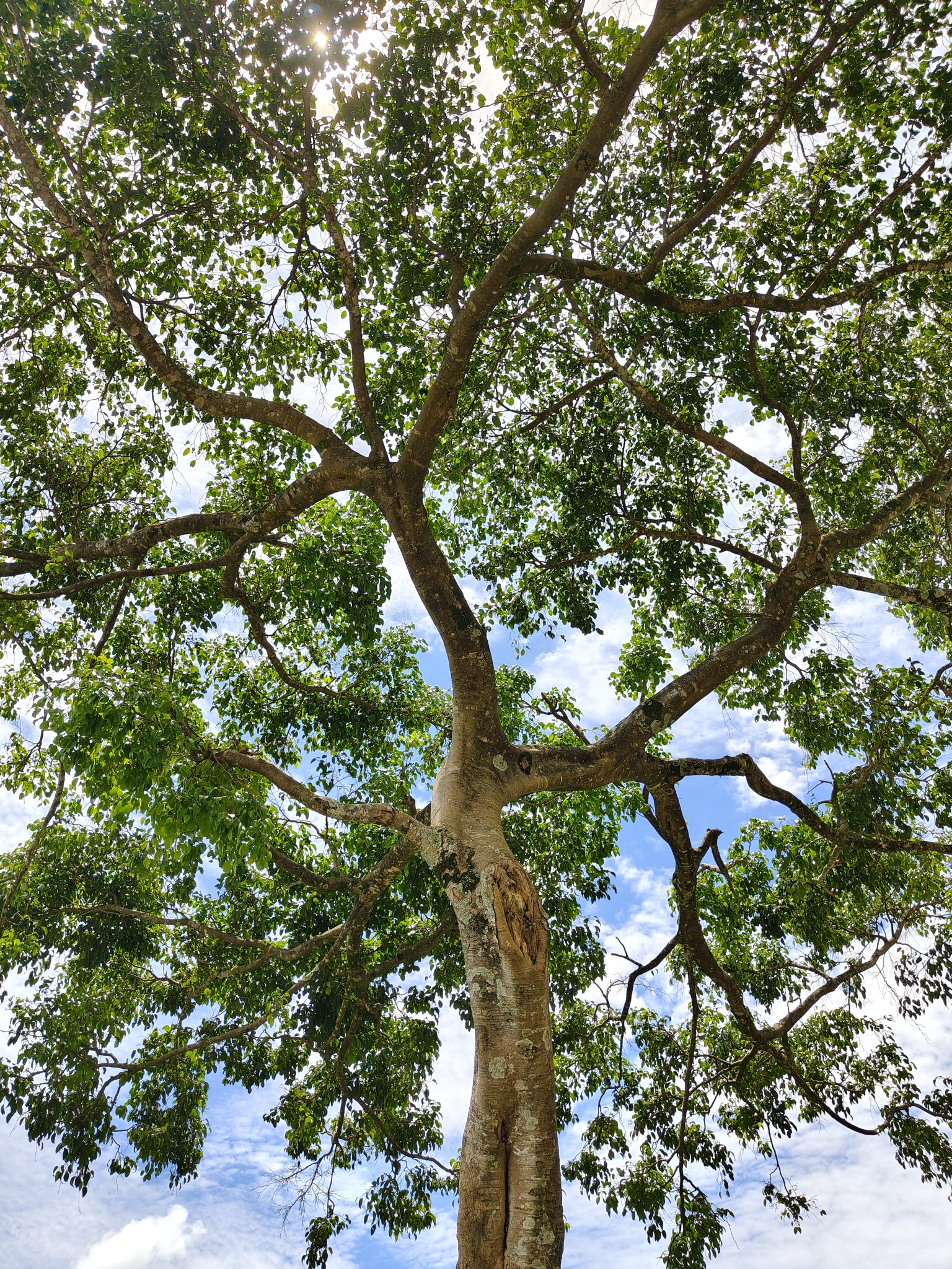 Alternative Text: A large tree viewed from below, showcasing its thick trunk and expansive branches covered with lush green leaves.
