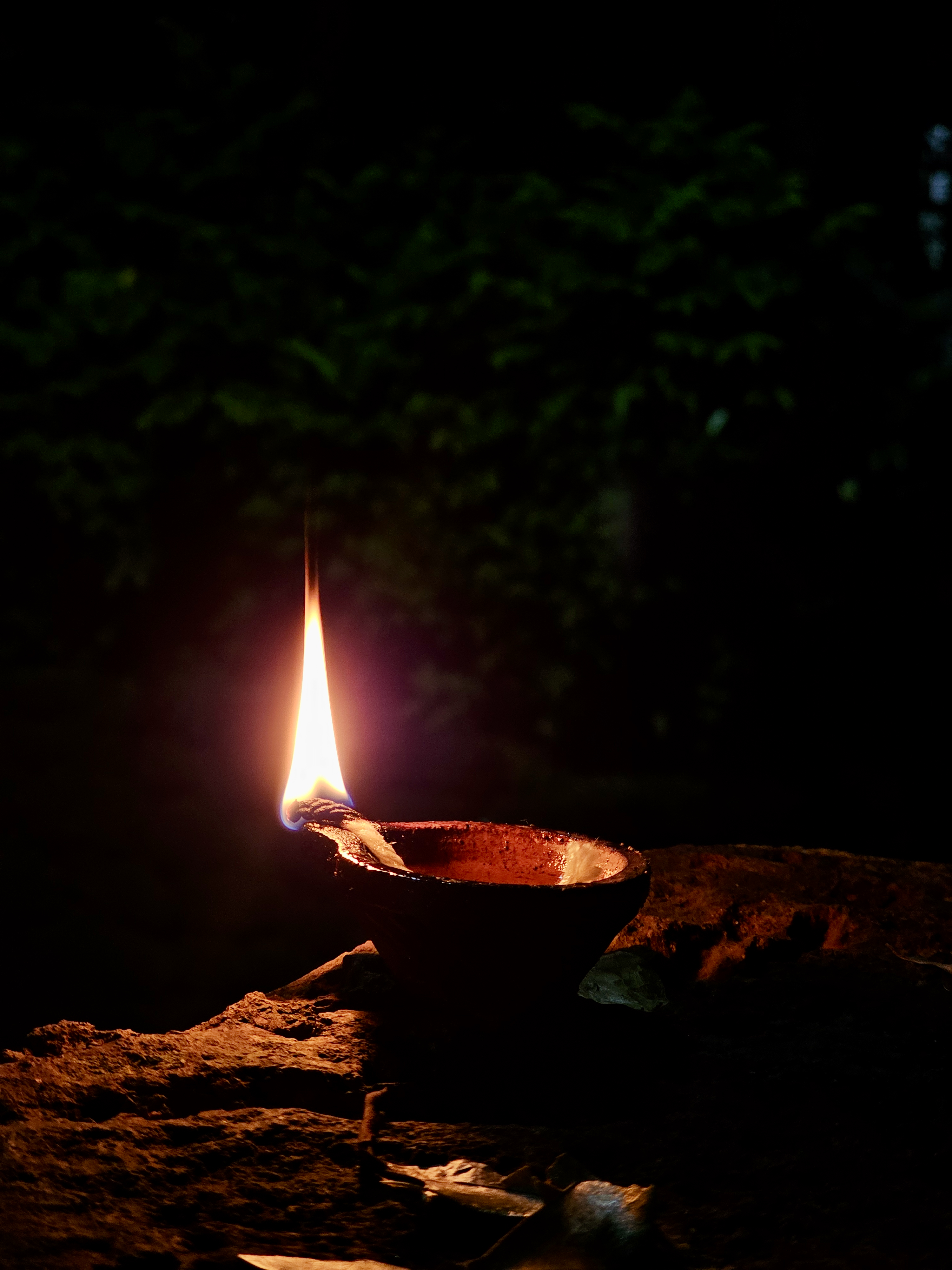Alternative Text: A single clay oil lamp burns brightly at night in Velliparamba, Kozhikode. The warm flame lights up the pot and the nearby surface, creating a cozy and peaceful feeling in the quiet darkness.