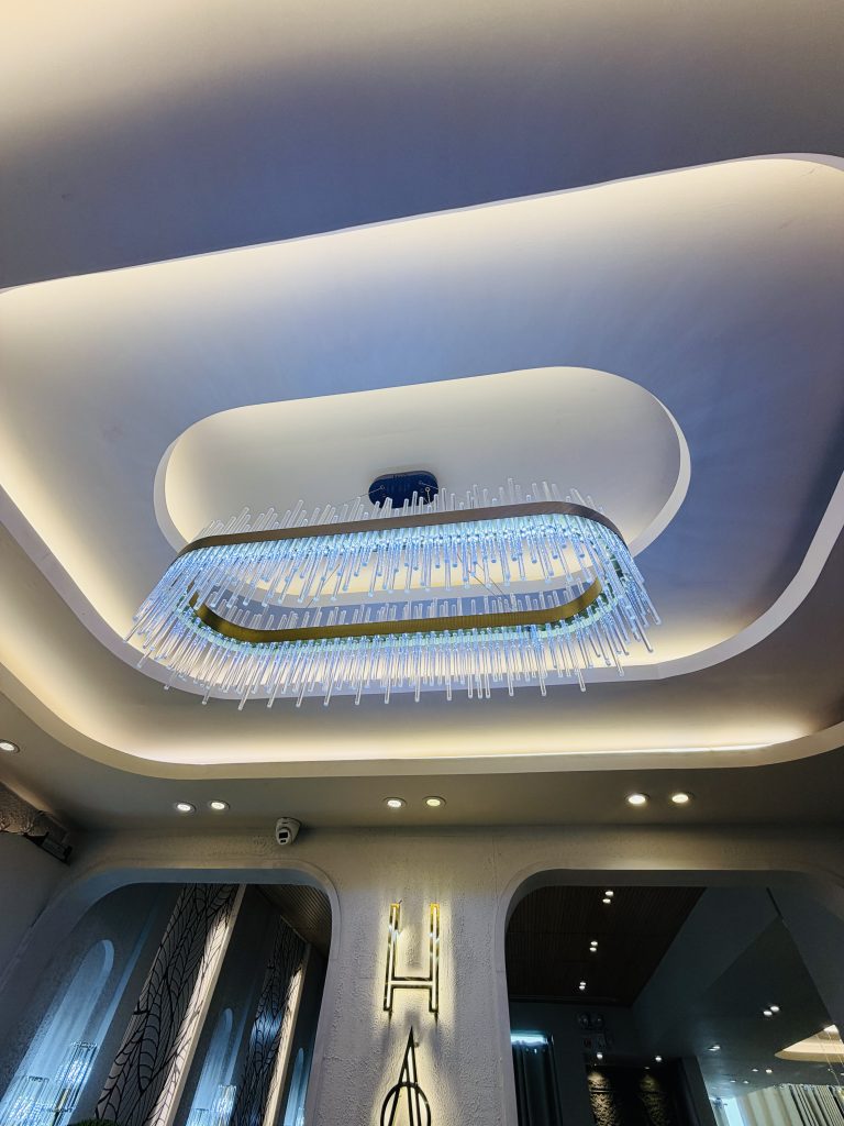 Alternative Text: Modern chandelier with blue glass tubes hangs from an oval recessed ceiling, creating a luxurious ambiance. Soft lighting adds elegance and charm.