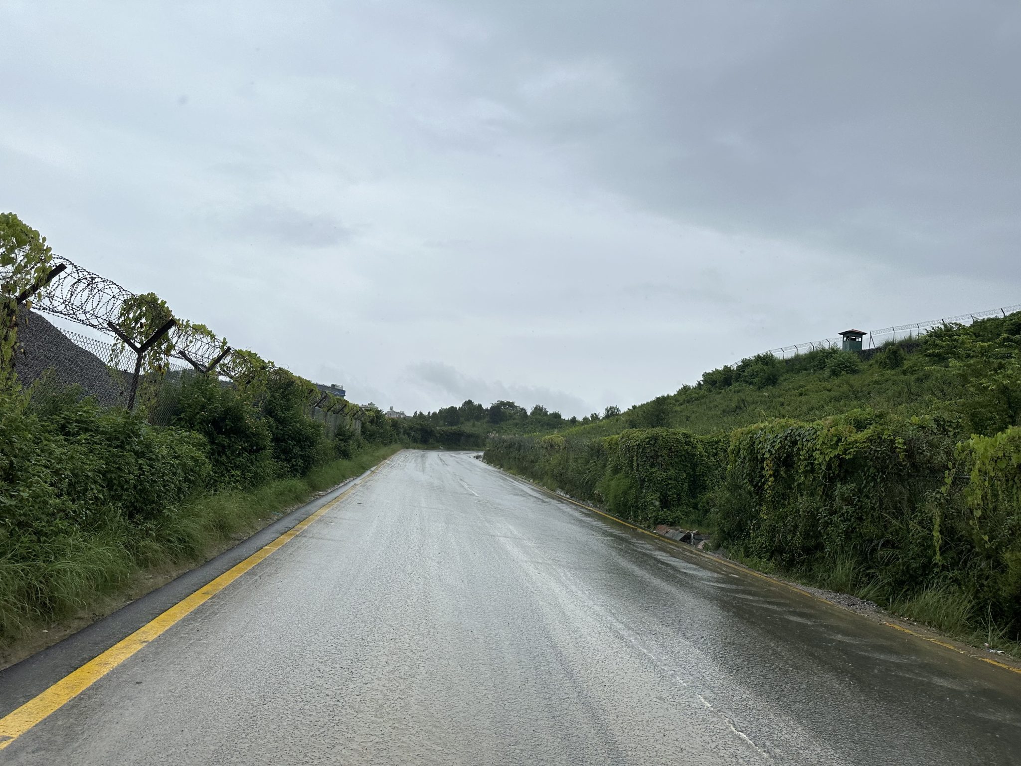 Alternative Text: Wet Road, Greenery, Small Hill and Wired Fence on the Side, Cloudy Sky During Rainfall
