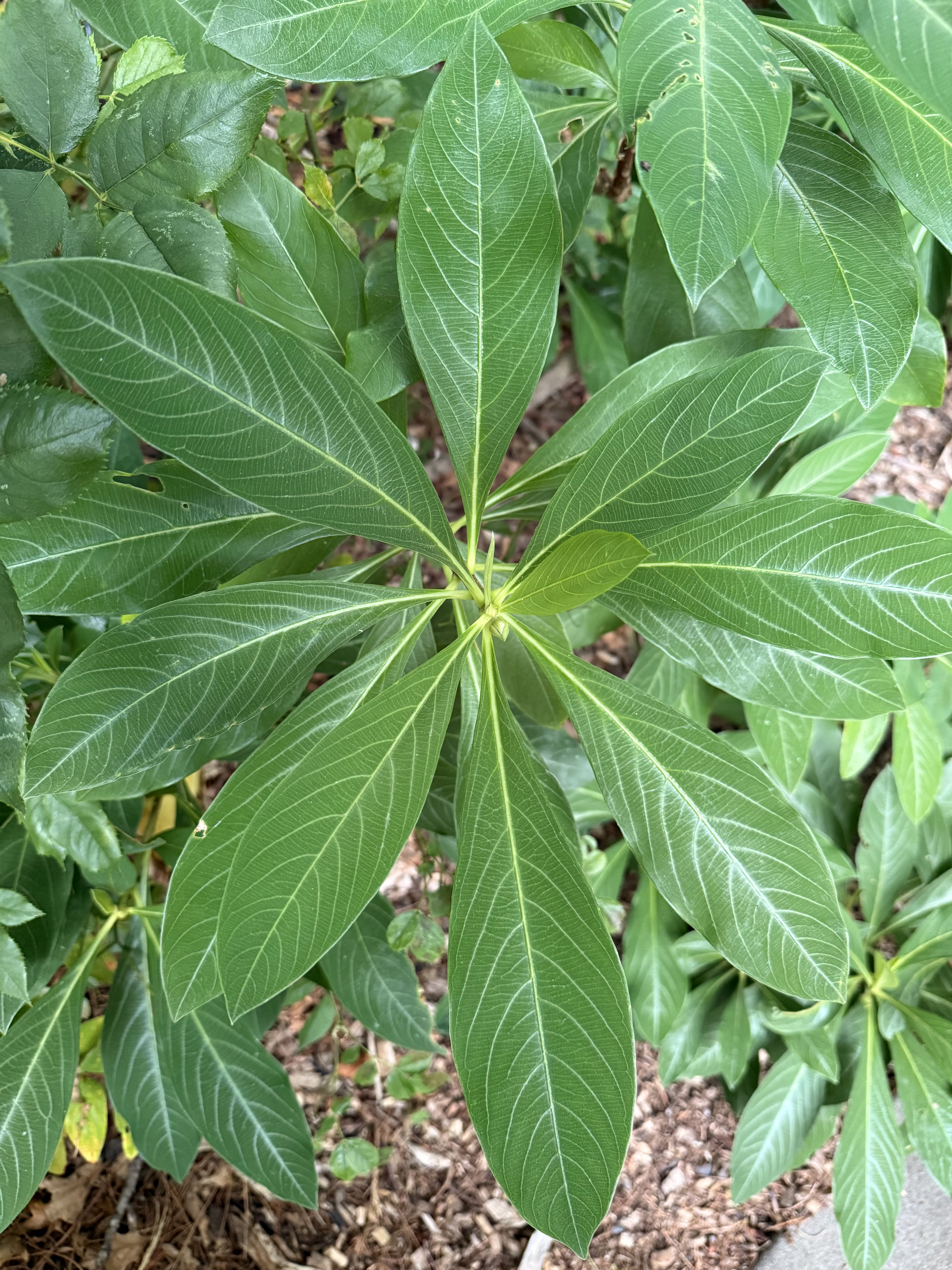 Alternative Text: A close-up of a symmetrical cluster of long green leaves with white veins, growing in a garden at Washington Park, Portland. The leaf pattern forms a star-like shape.