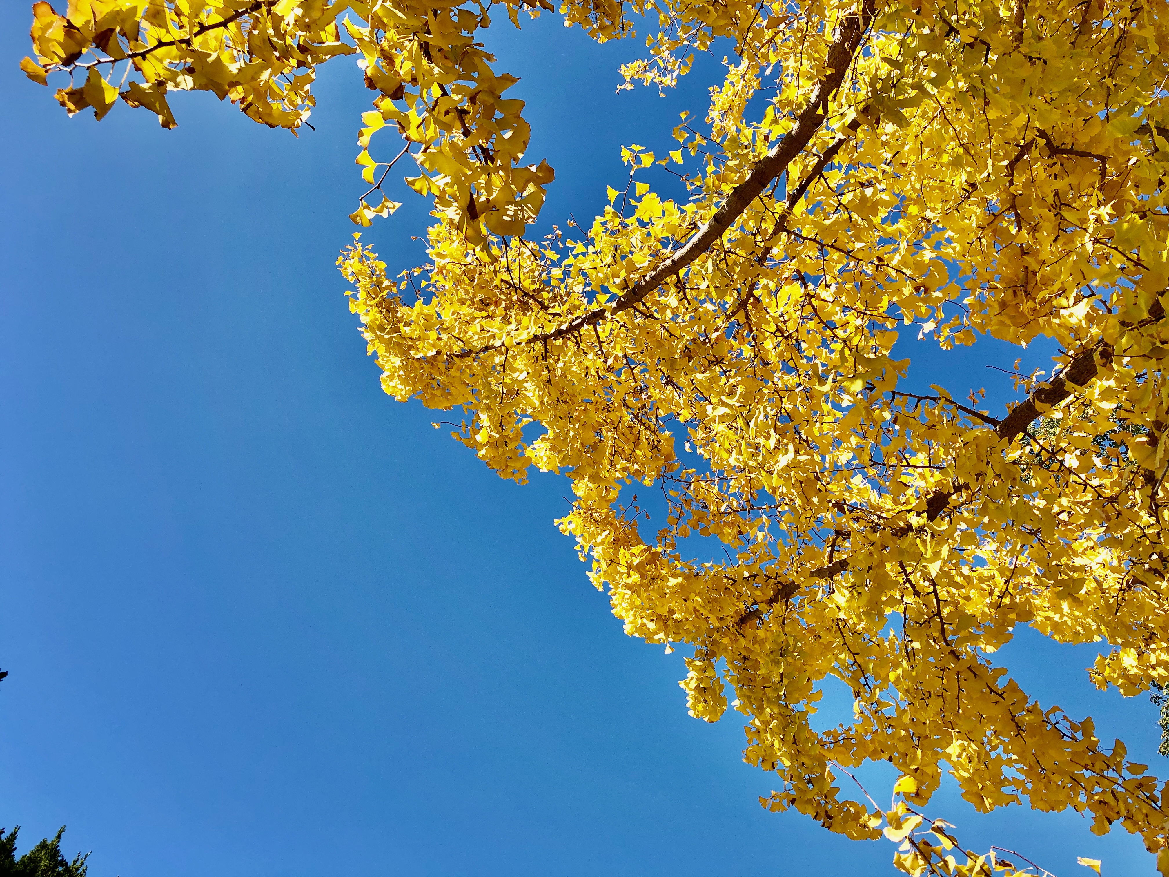 Alternative Text: Japan, Osaka, suburb, ginkgo, autumn, blue sky