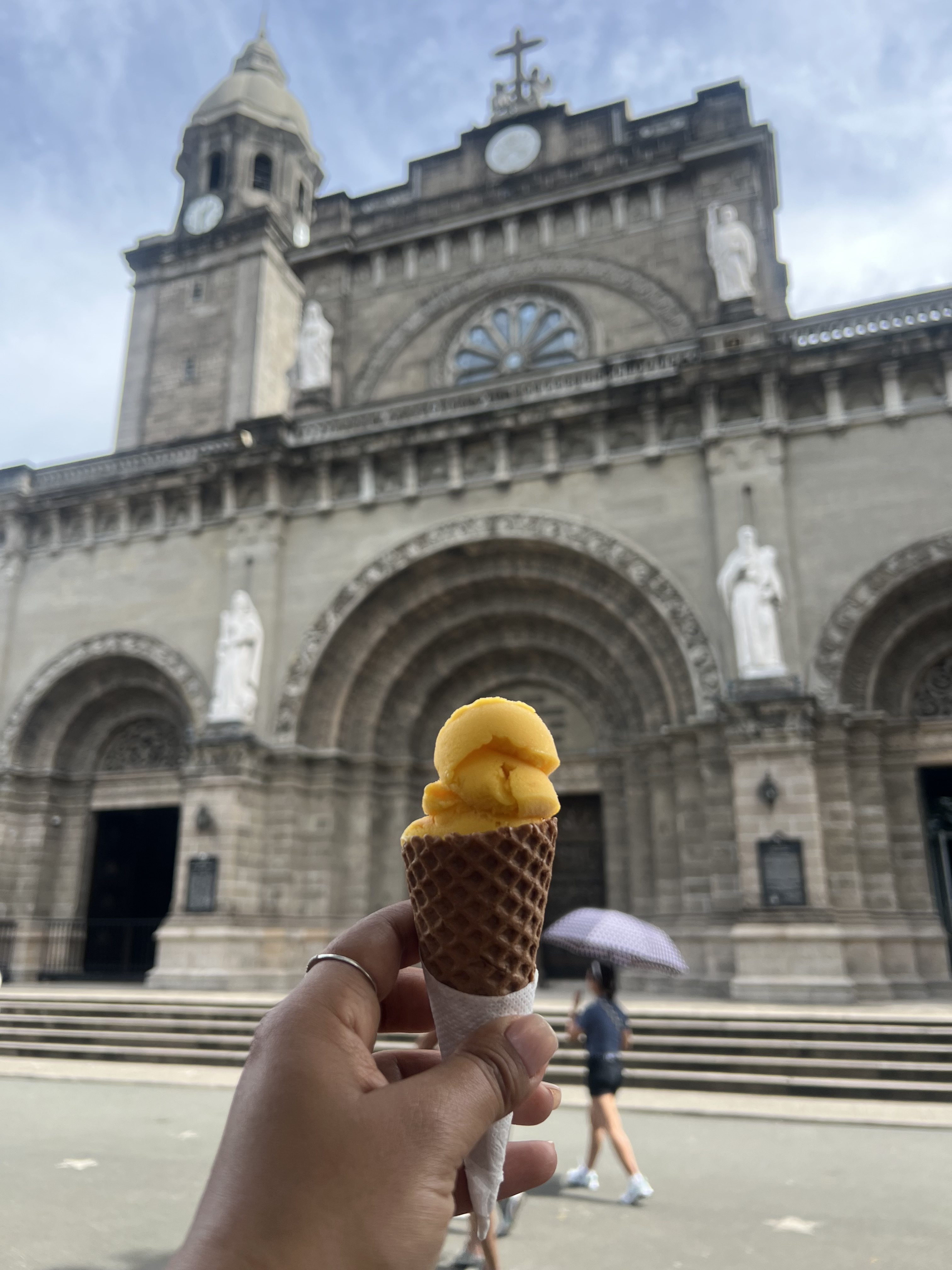 Alternative Text: A person holds a mango-flavored ice cream cone up in front of a large, stone church with a detailed facade.